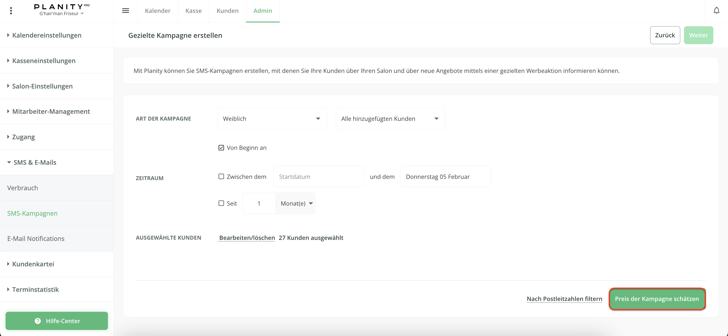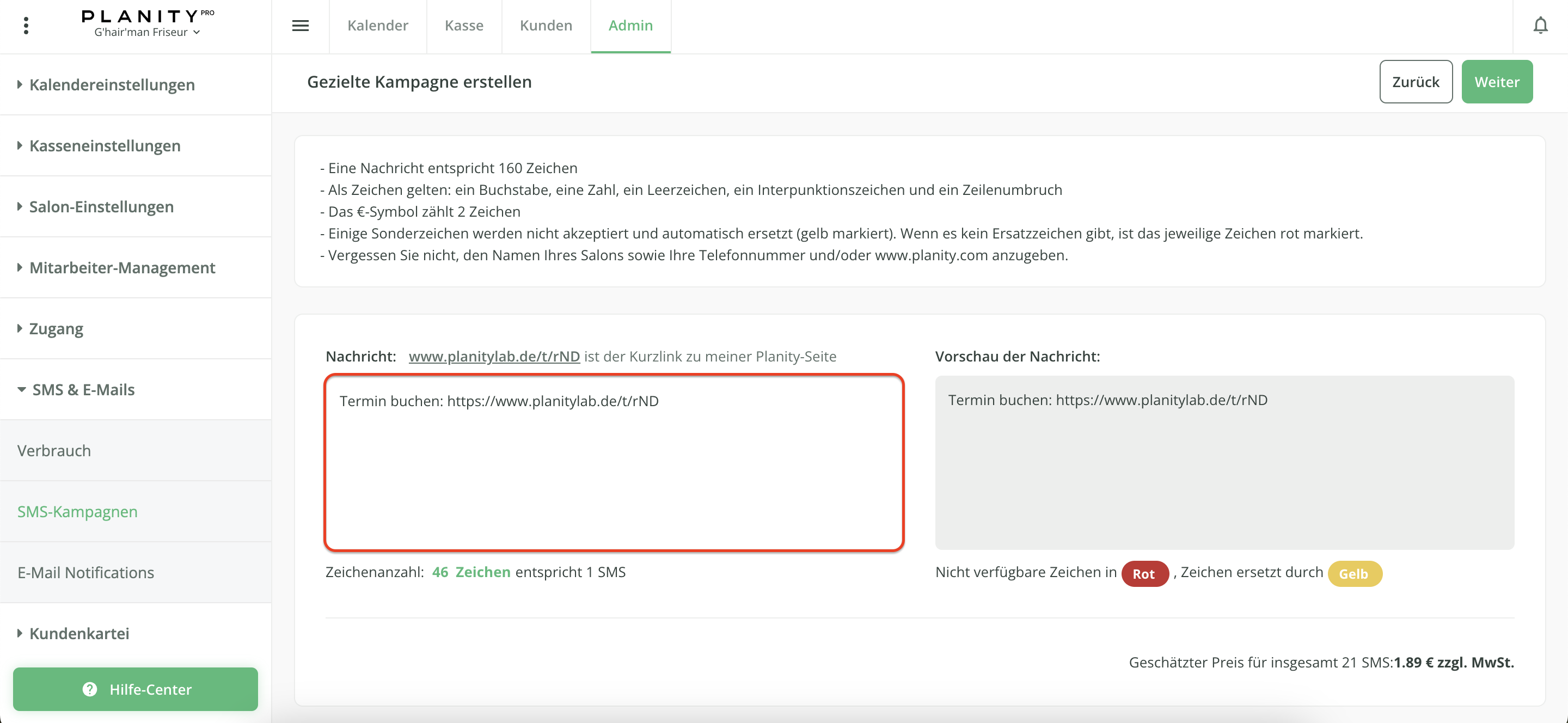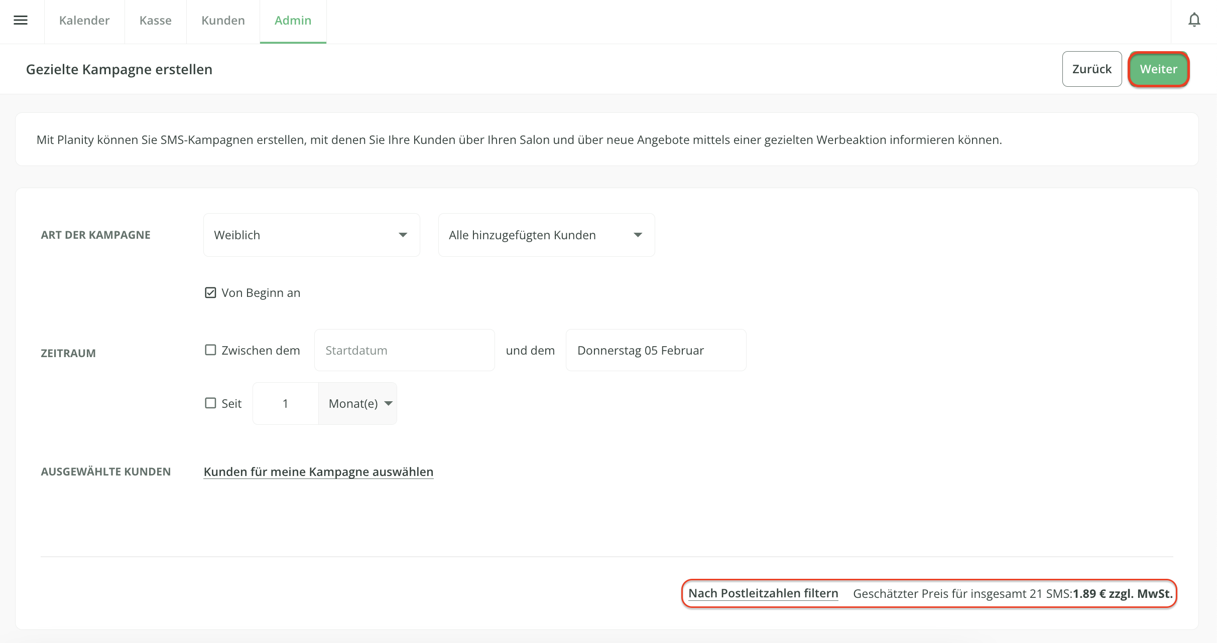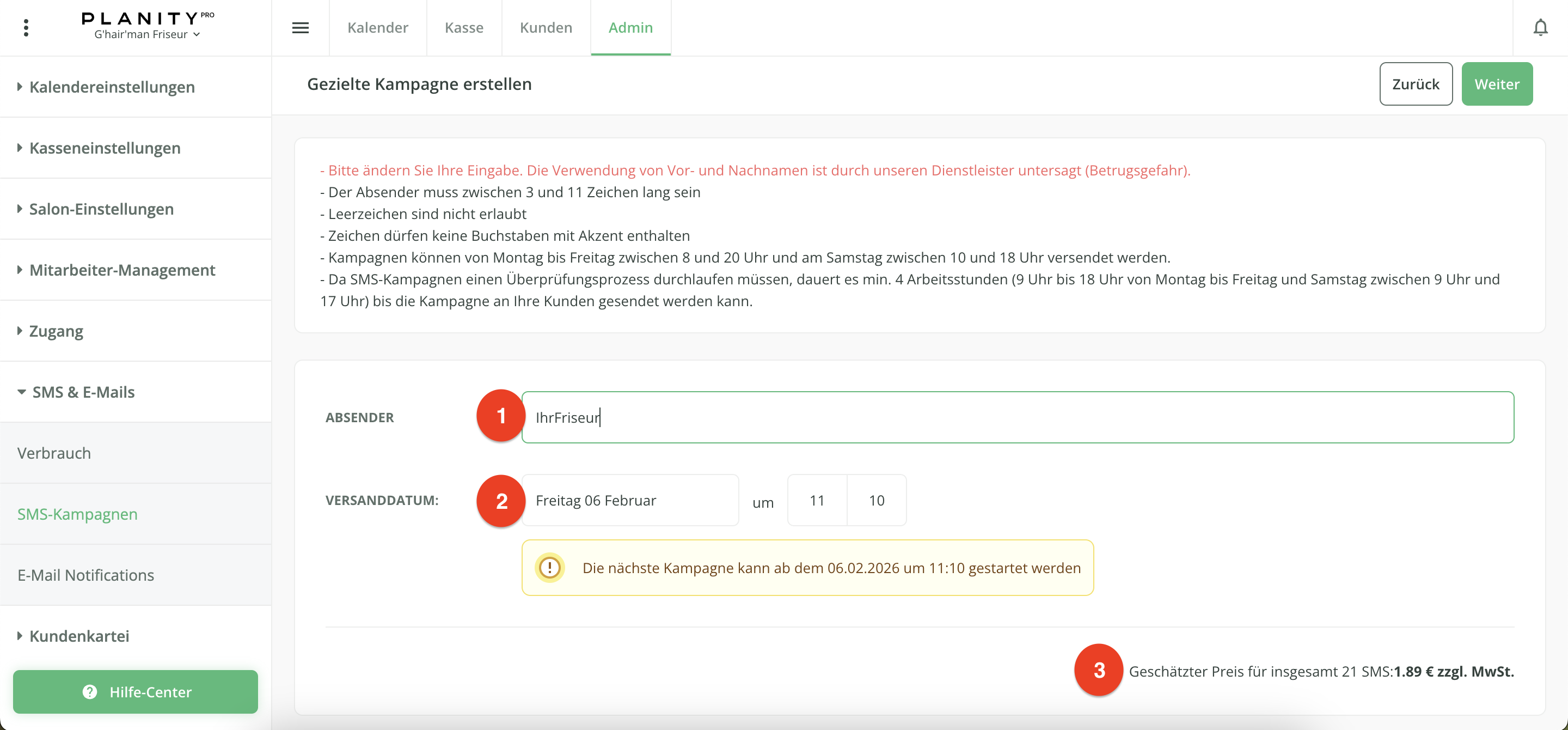 - Der Preis der SMS-Kampagne wird nochmals angezeigt.