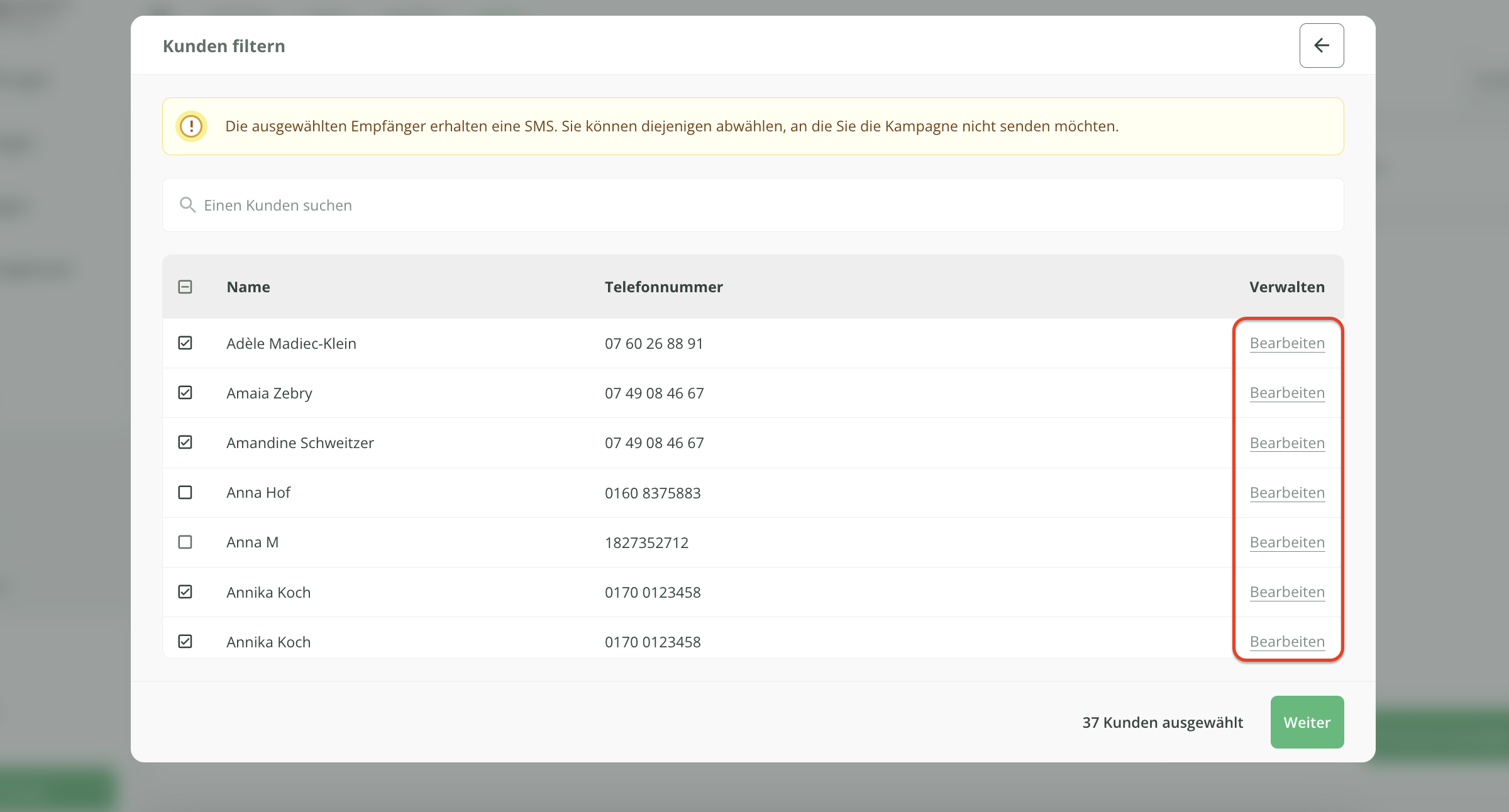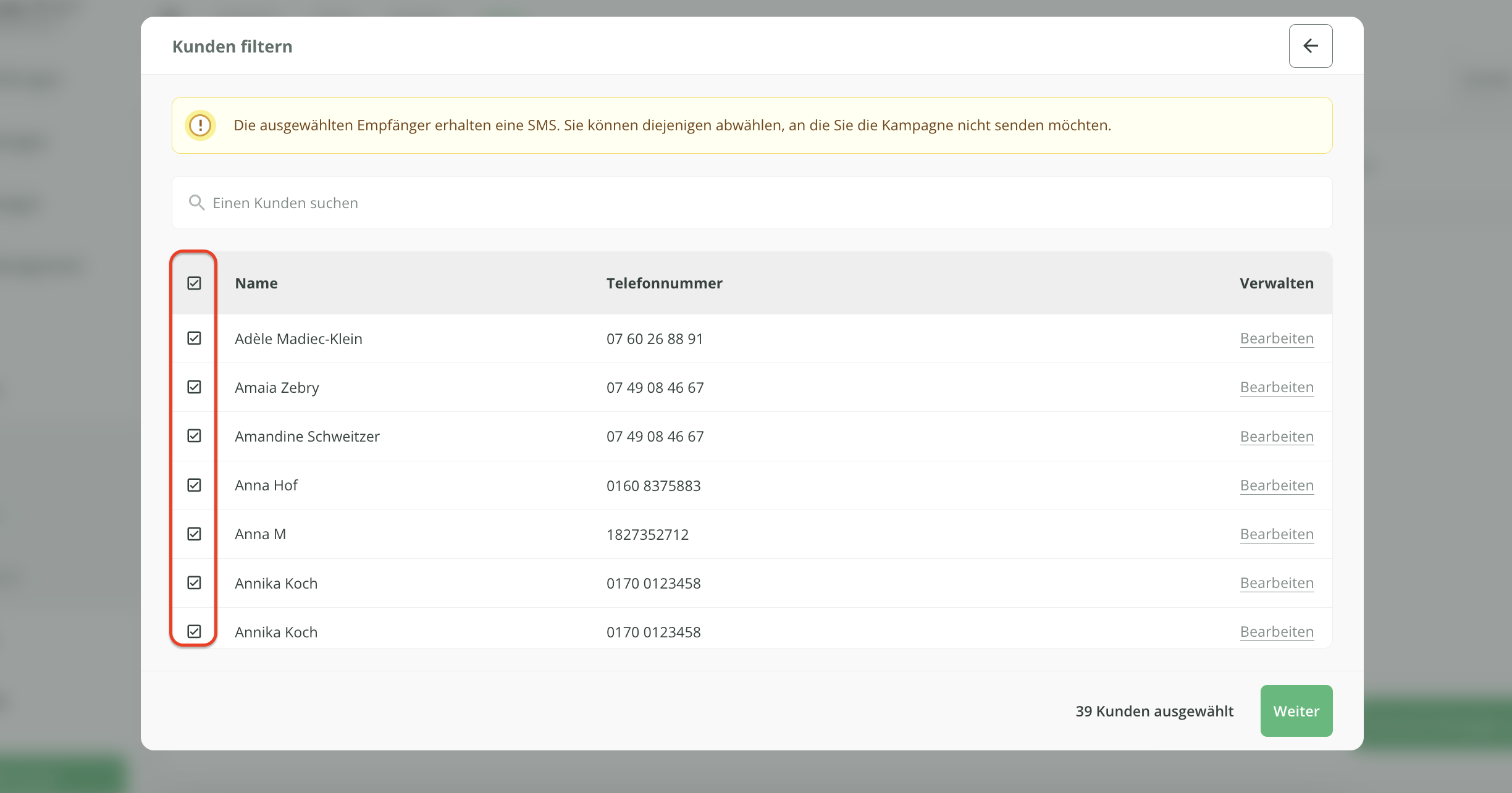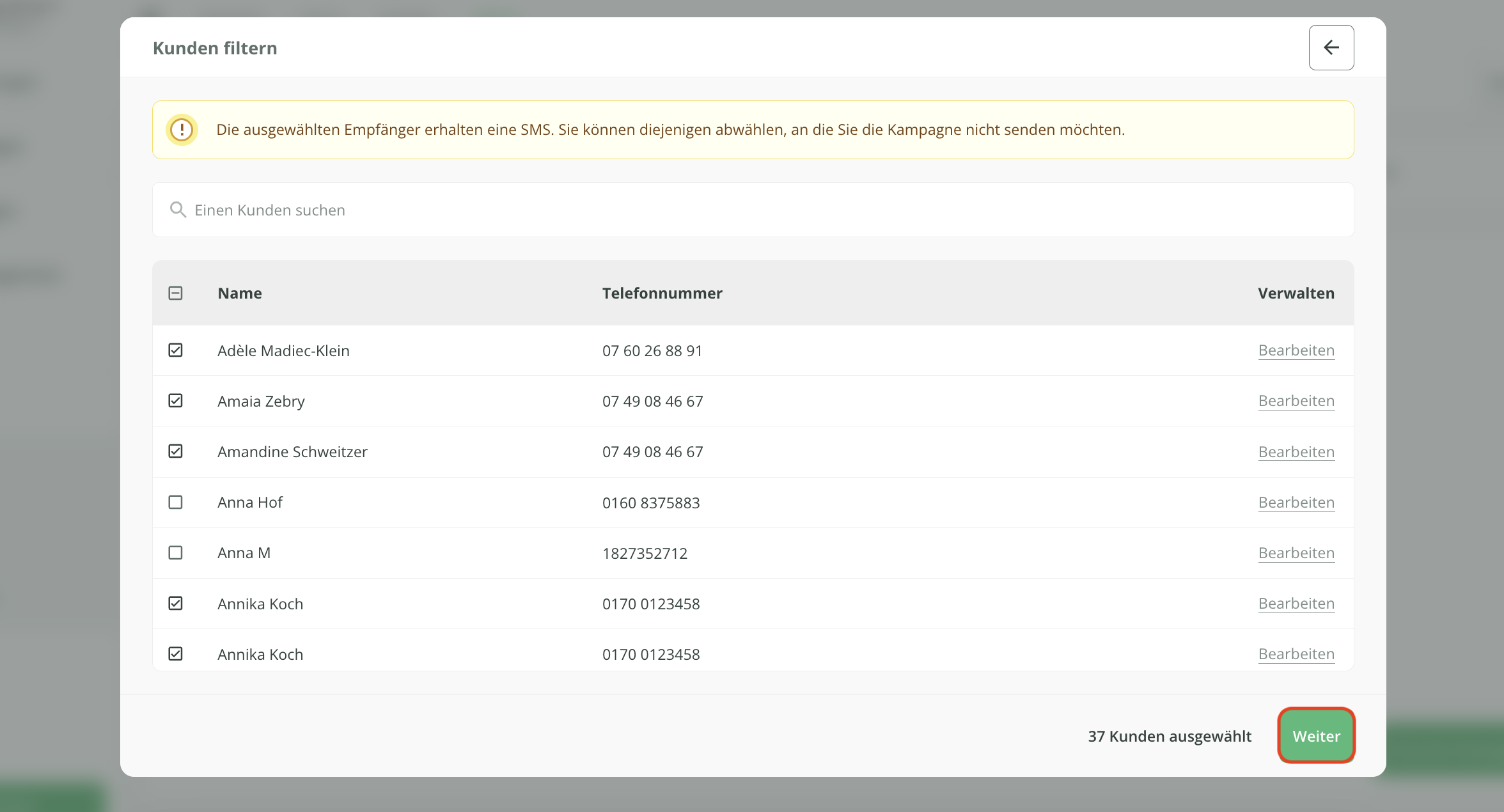 Kunden, die den von Ihnen ausgewählten Kriterien entsprechen und für die eine Telefonnummer in der Kundenkartei hinterlegt ist, werden automatisch ausgewählt. Bei Bedarf können Sie diejenigen Kunden abwählen, die Ihre Kampagne nicht erhalten sollen.