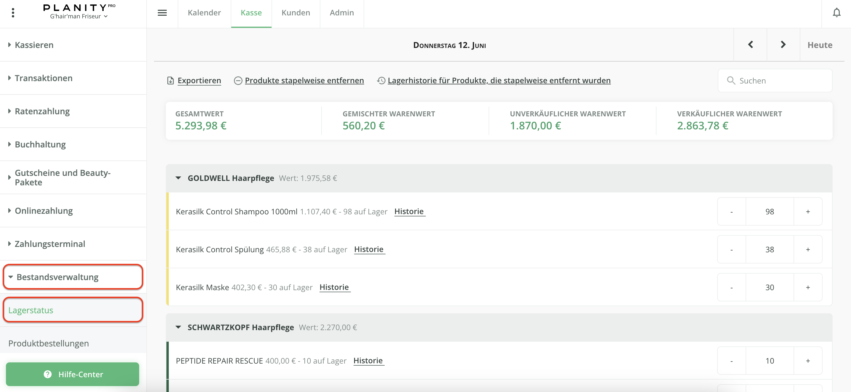 - Klicken Sie nun auf Bestandsverwaltung und anschließend auf Lagerstatus