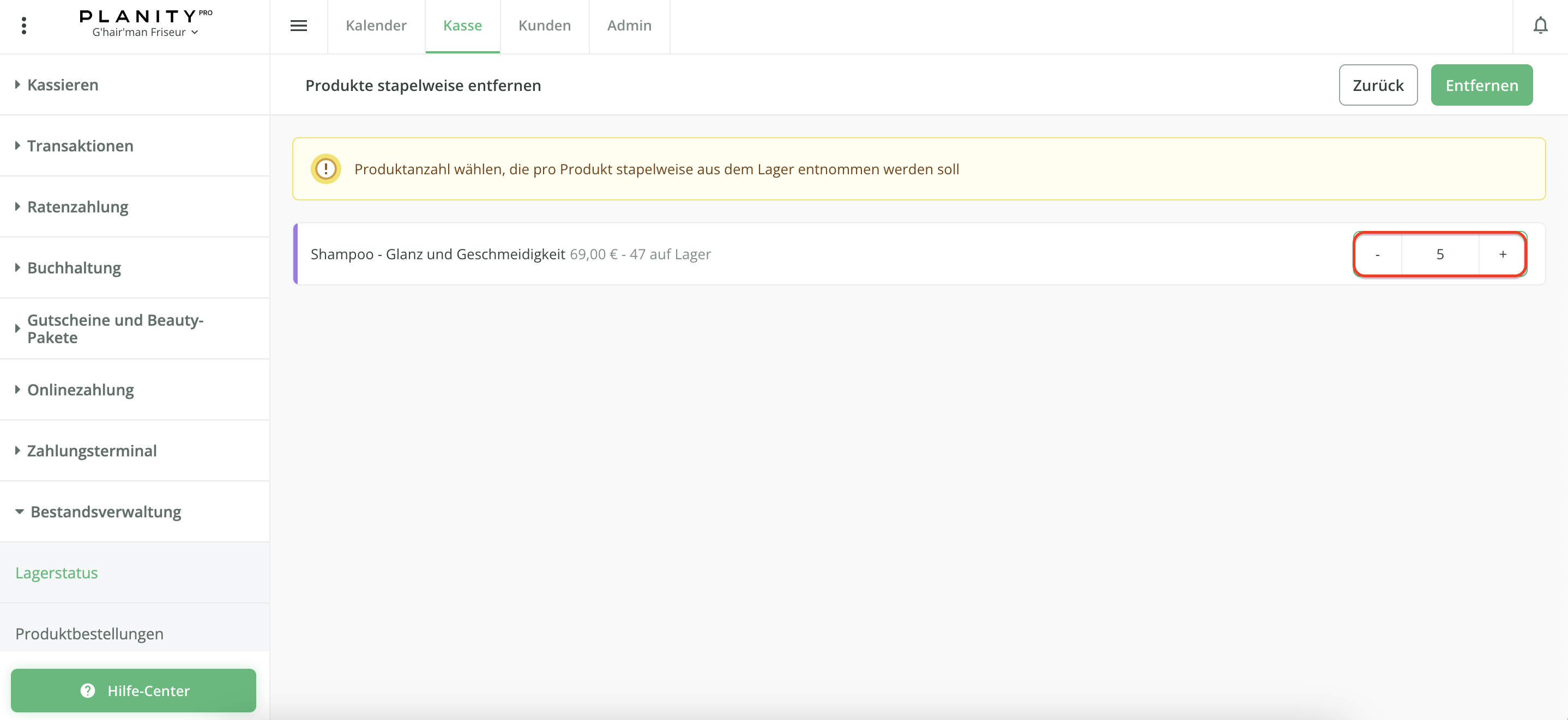 - Scannen Sie dann ein Produkt, um eine Massenentnahme durchzuführen. Nach dem Scannen können Sie über die Schaltflächen + und - die zu entnehmende Menge definieren.