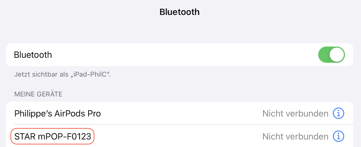 - Deaktivieren und reaktivieren Sie das Bluetooth, damit die mPOP wieder unter den Geräten erscheint