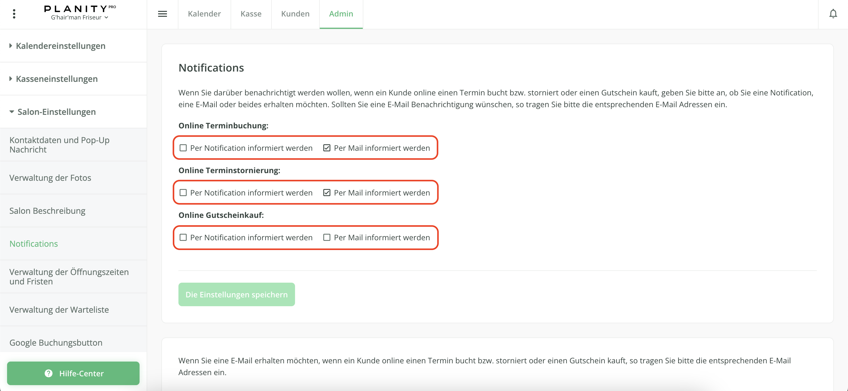 - Wählen Sie für jede Art von Benachrichtigung (neue Online-Terminbuchung, Online-Terminstornierung, Online Gutscheinkauf) aus, wie Sie diese erhalten möchten: