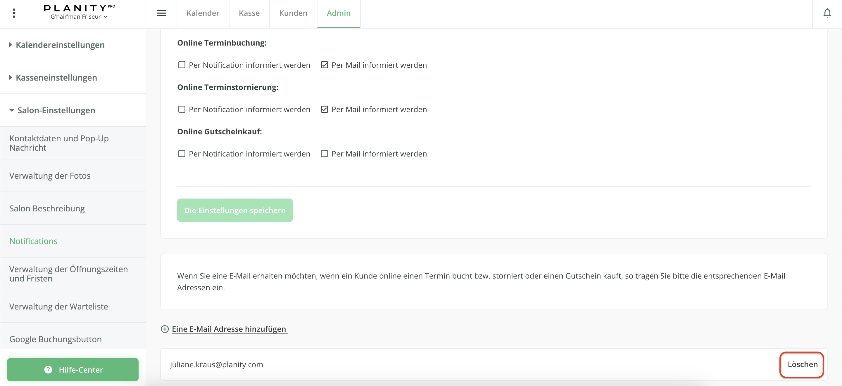 - Sie können eine Adresse löschen, wenn Sie keine E-Mails mehr über vereinbarte oder abgesagte Termine bzw. über online verkaufte Gutscheine erhalten möchten.