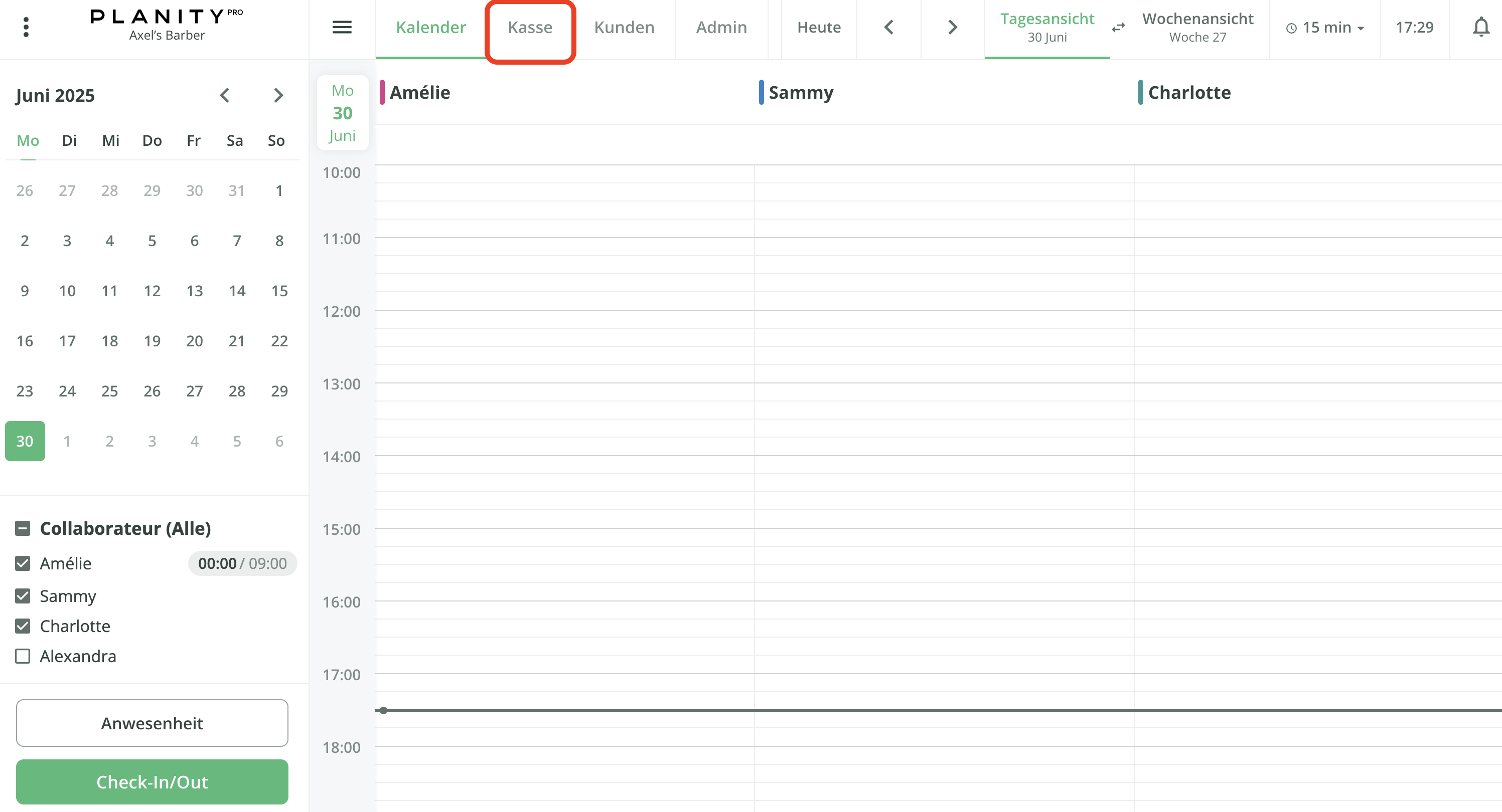 Um die Kasse zu aktivieren, wenden Sie sich bitte an Ihren Planity-Berater oder klicken Sie auf den Reiter „Kasse” oben im horizontalen Hauptmenü von Planity Pro.
