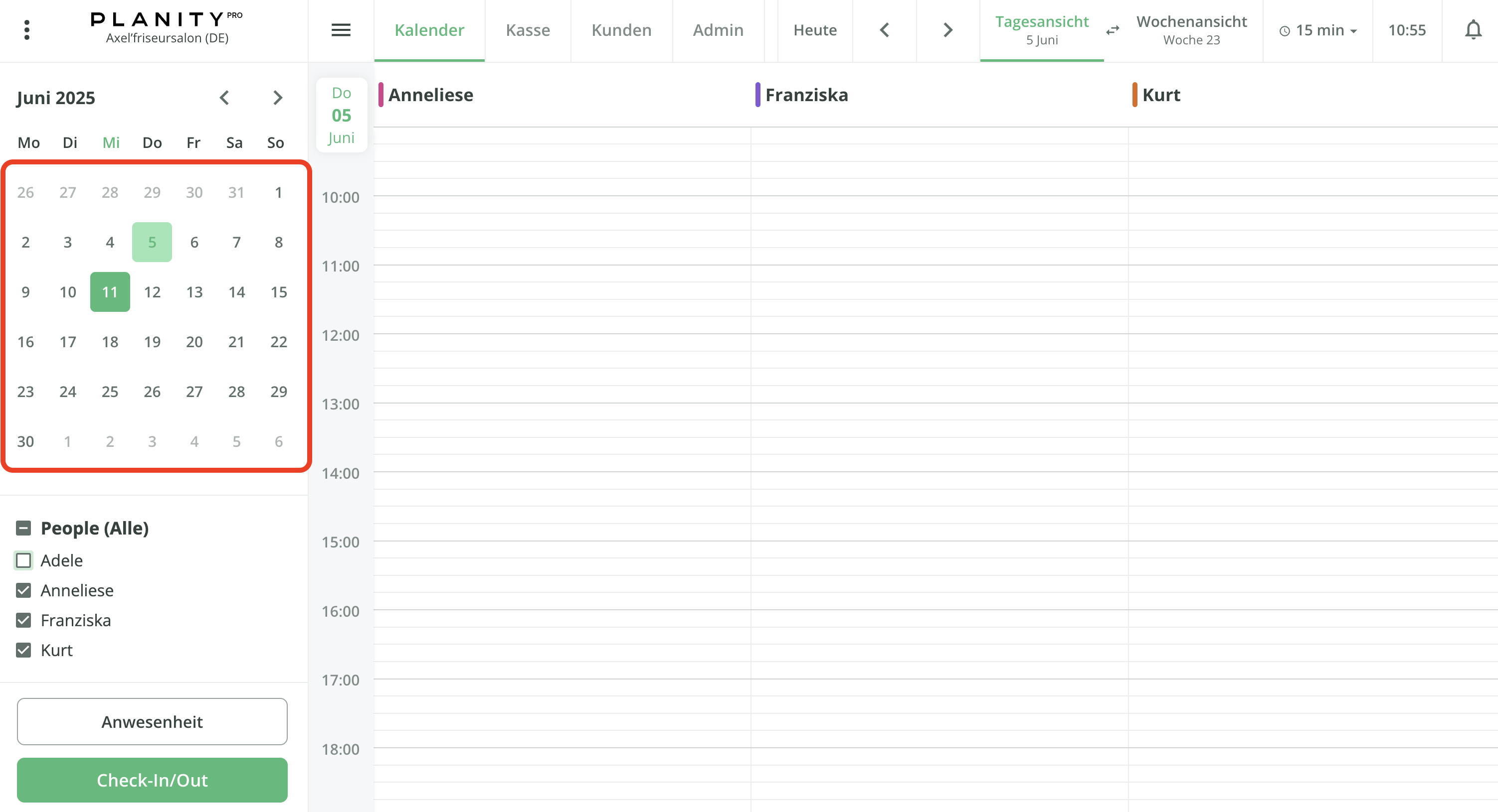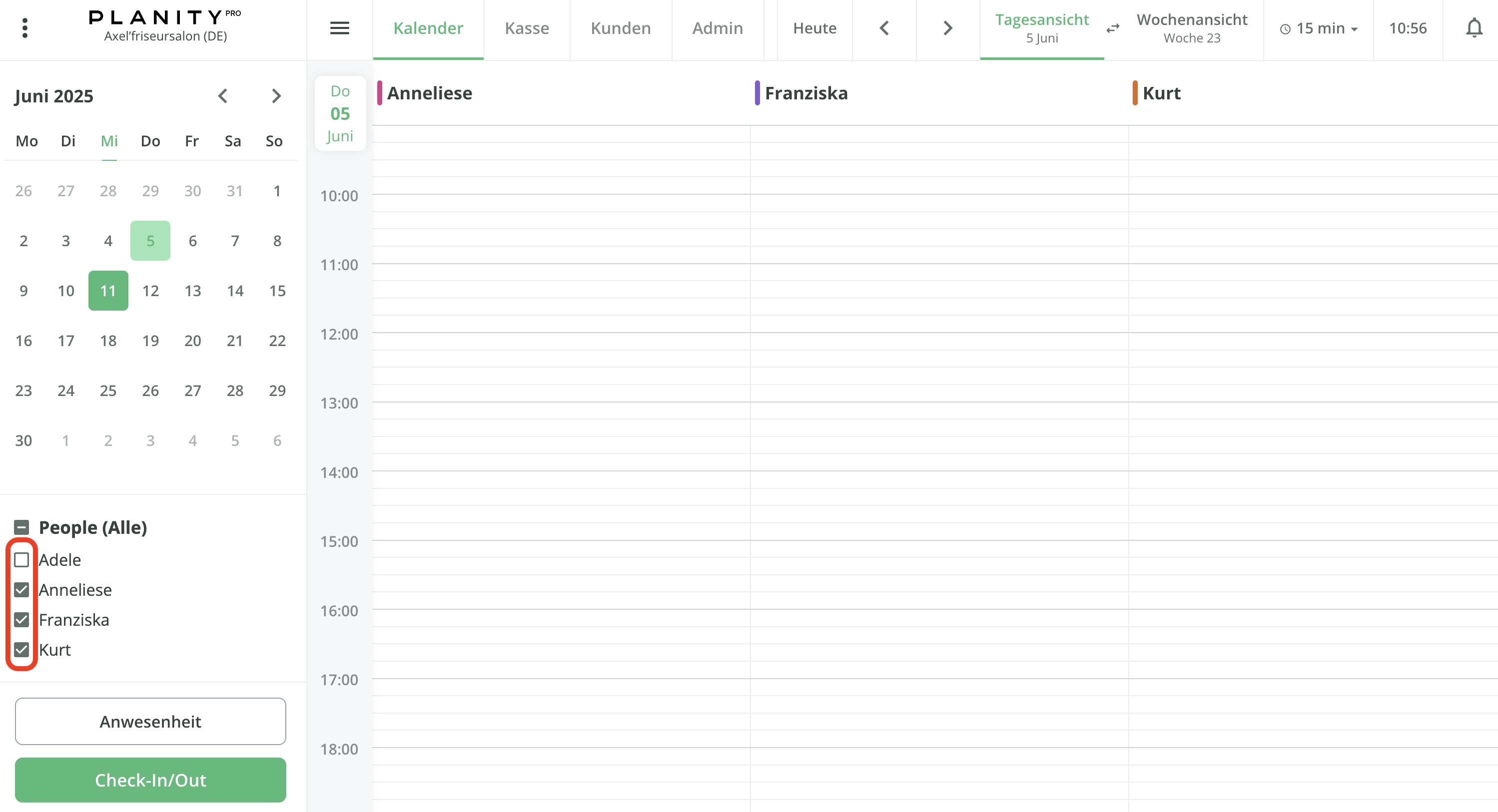 Sie können wählen, ob der Kalender eines Mitarbeiters oder einer Ressource angezeigt werden soll. Klicken Sie dazu unten links auf dem Bildschirm auf den entsprechenden Eintrag.