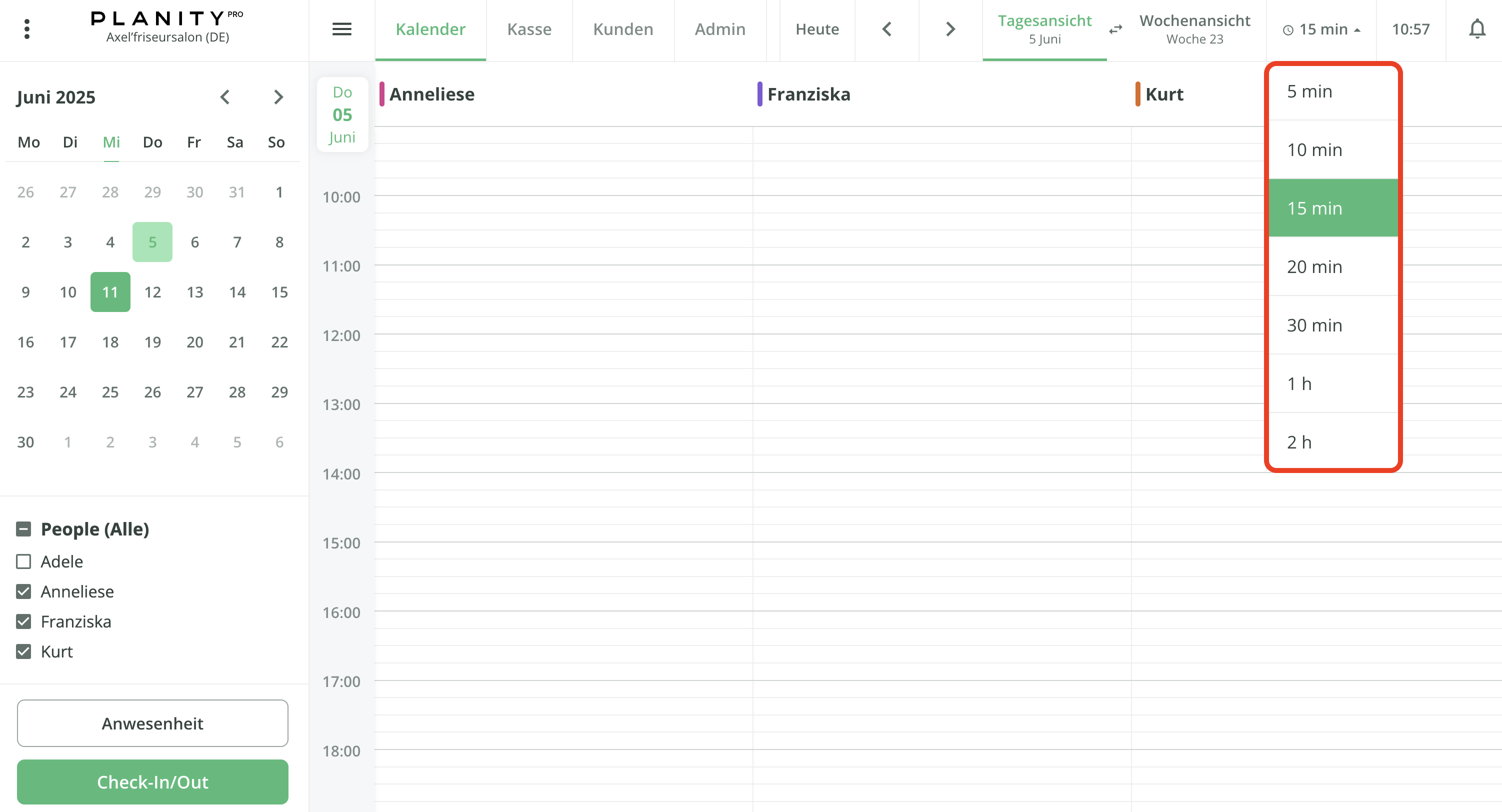 In Ihrem Kalender gibt es mehrere Einstellungen, die Sie ändern können: die Tag-/Wochenansicht des Kalenders, die Sichtbarkeit der Kalender Ihrer Mitarbeiter und Ressourcen und die Länge des Intervalls zwischen den einzelnen Zeilen des Kalenders.