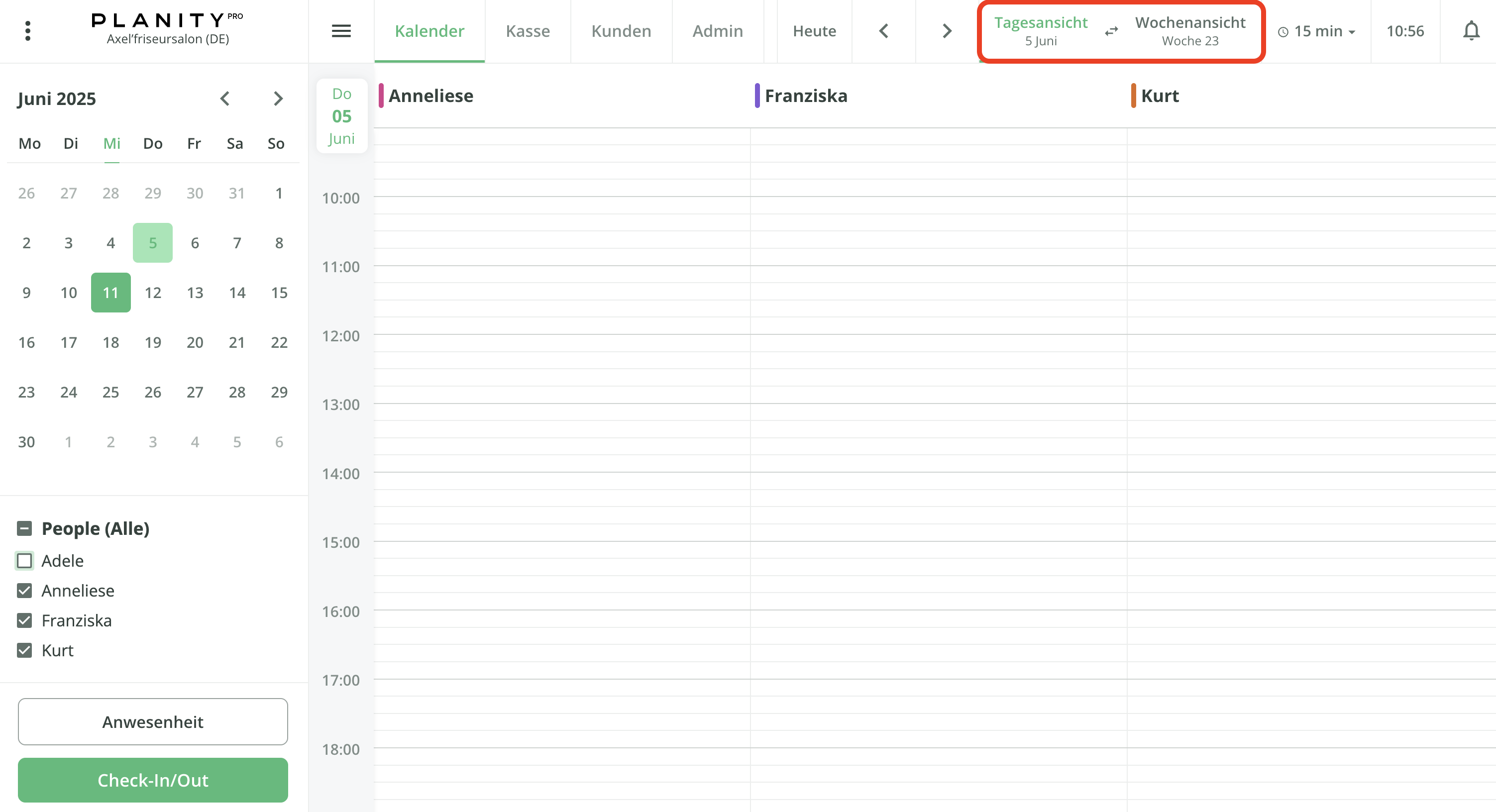 Am oberen Bildschirmrand können Sie zwischen der Tages- oder Wochenansicht Ihres Kalenders wählen. Klicken Sie dazu auf die gewünschte Häufigkeit.