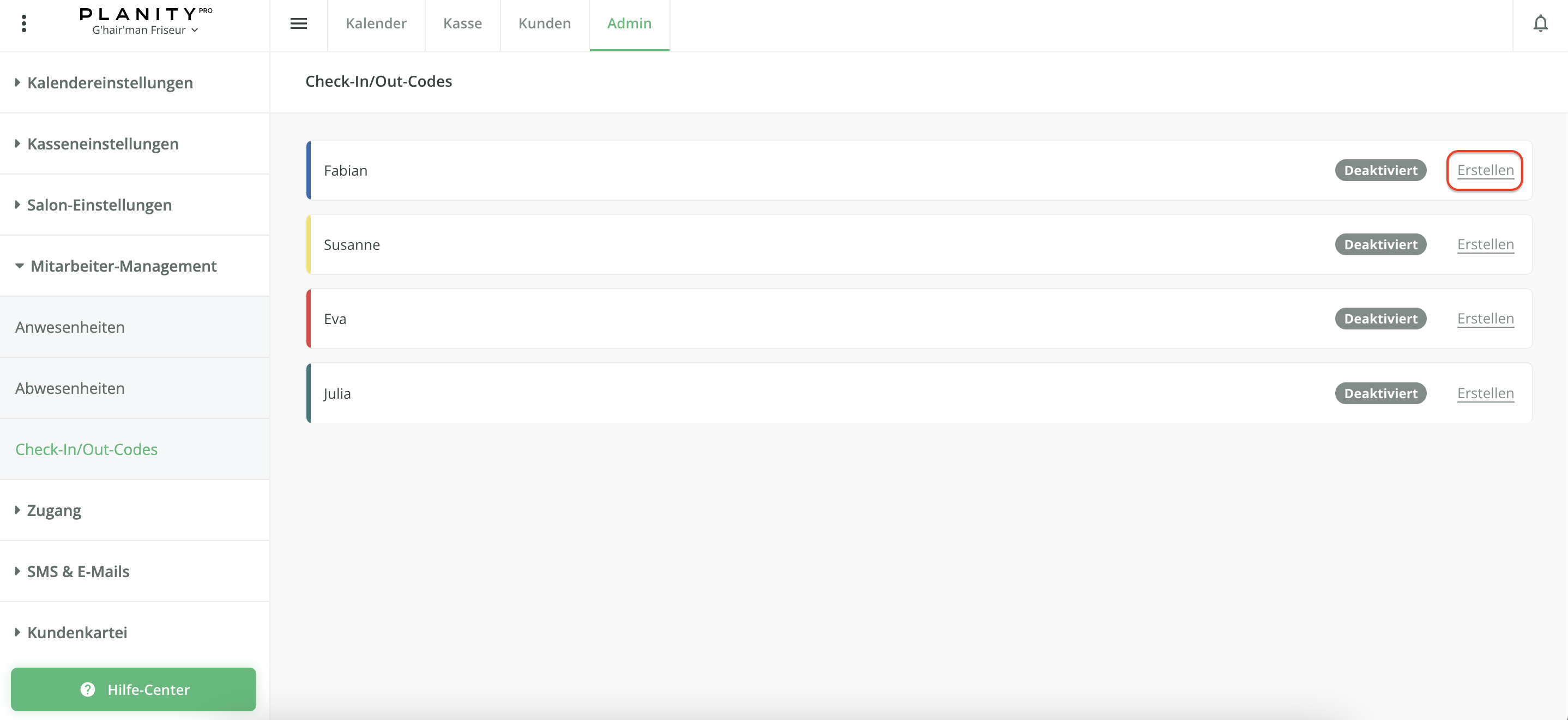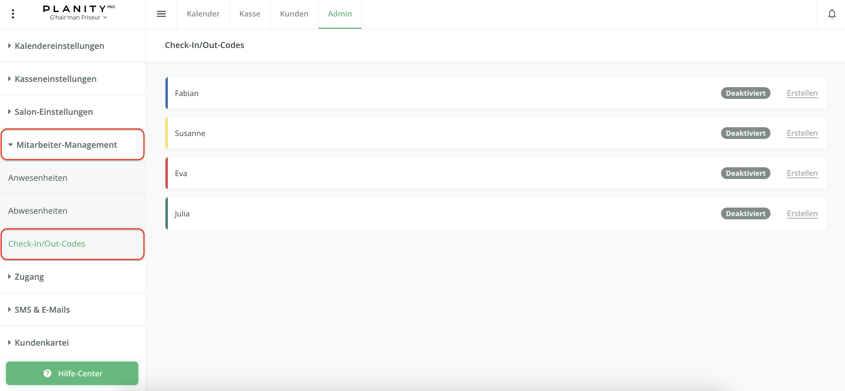- Klicken Sie nun auf das Untermenü Mitarbeiter-Management auf der linken Seite Ihres Bildschirmsund anschließend auf Check-In/Out-Codes.