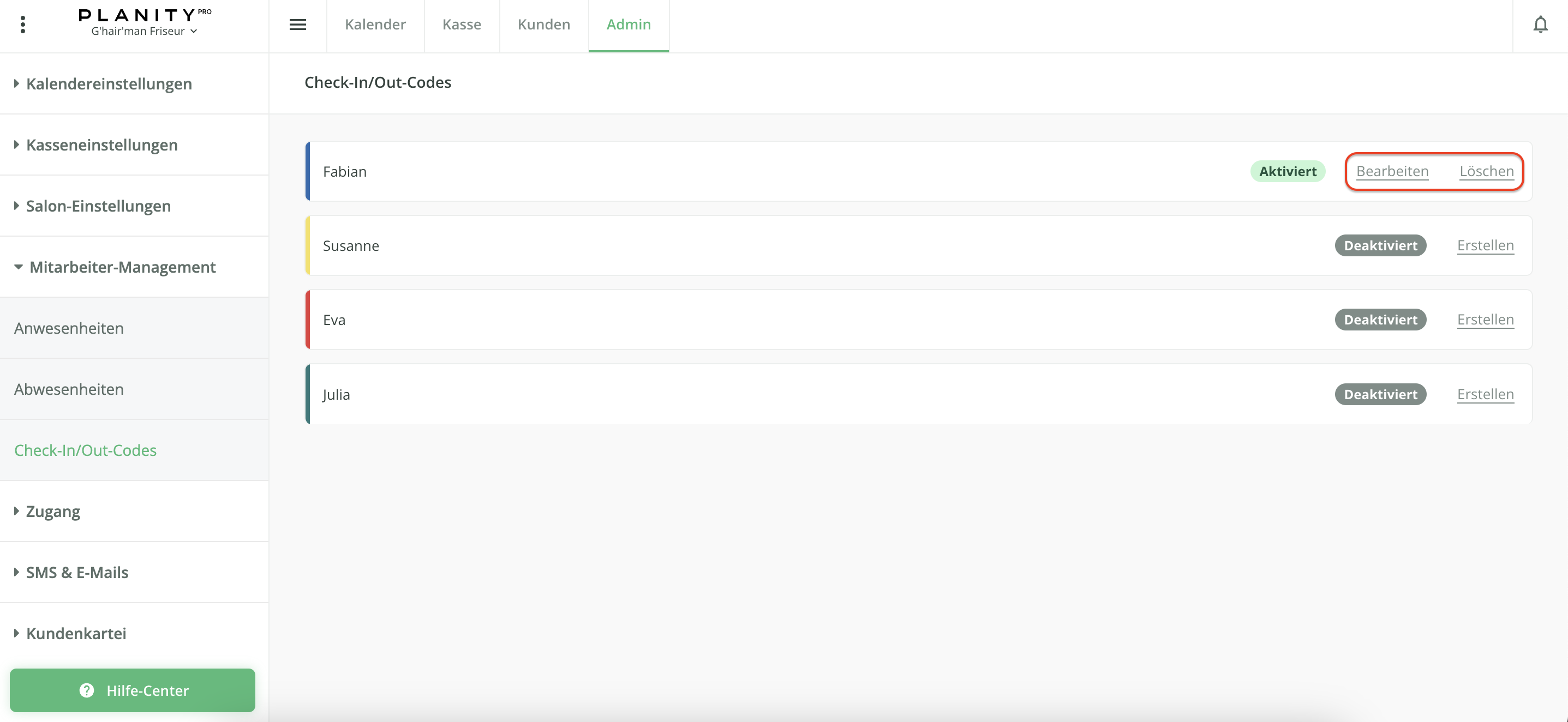 - Sobald der Check-In/Out-Code erstellt wurde, können Sie ihn jederzeit mithilfe der Schaltflächen Ändern oder Löschen in der Zeile des betreffenden Mitarbeiters bearbeiten oder entfernen.