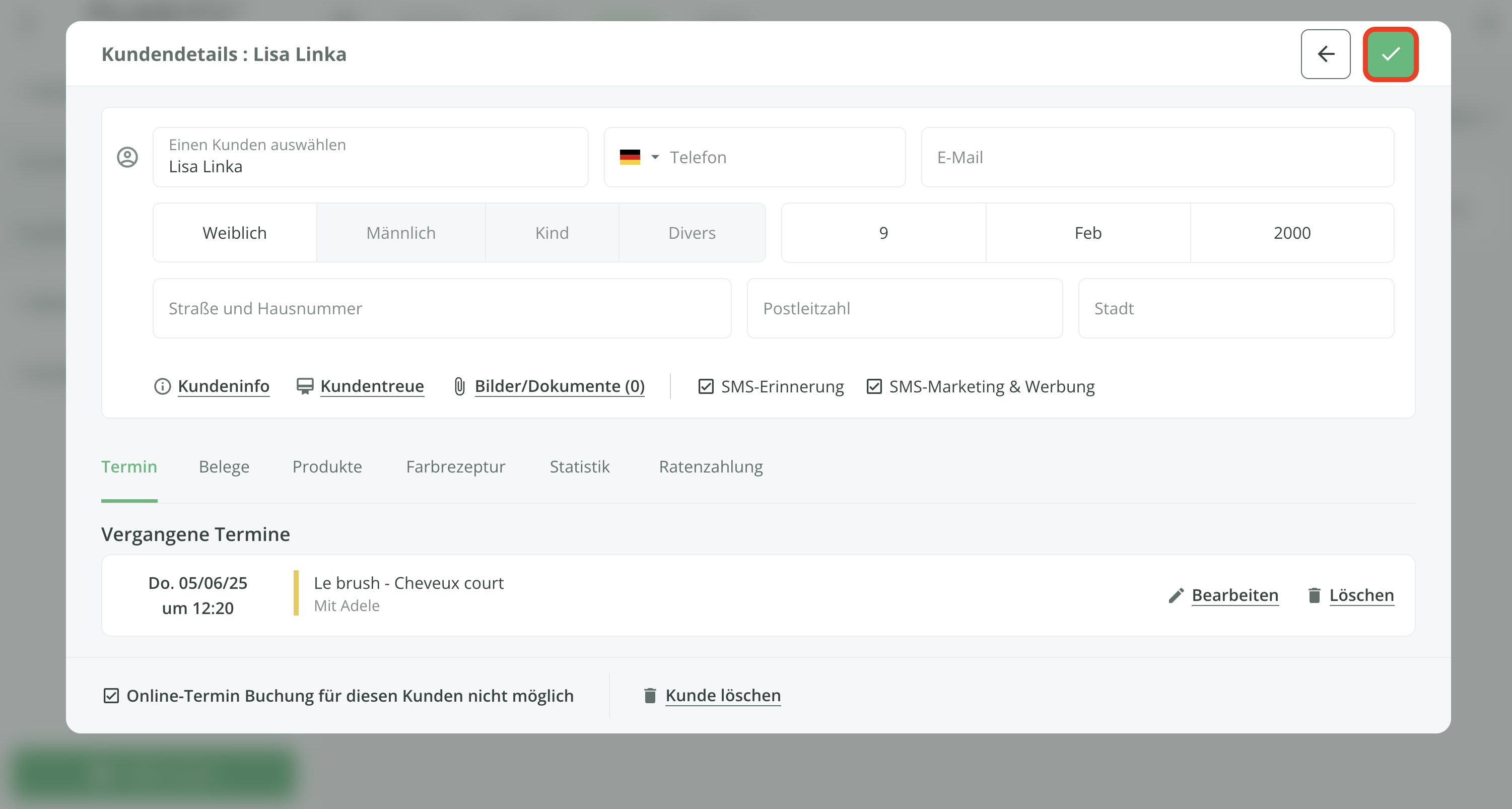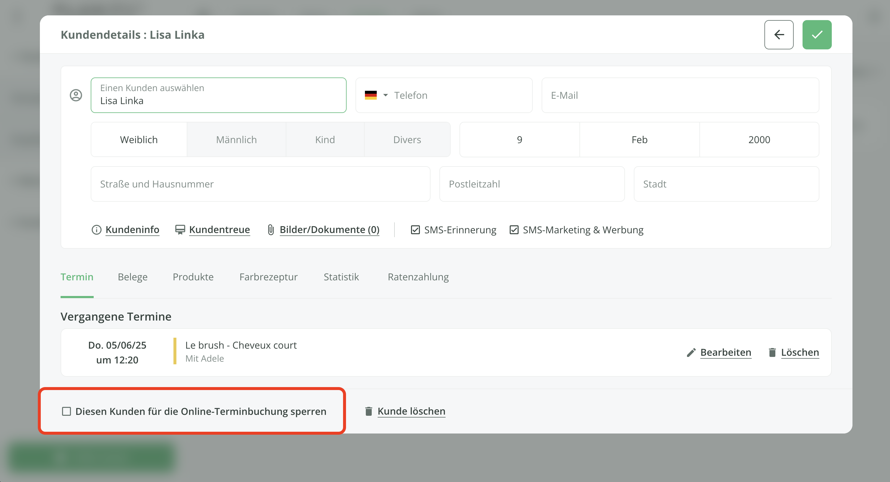 - Aktivieren Sie das Kontrollkästchen Diesen Kunden für die Online-Terminbuchung sperren in der linken unteren Ecke Ihres Bildschirms.