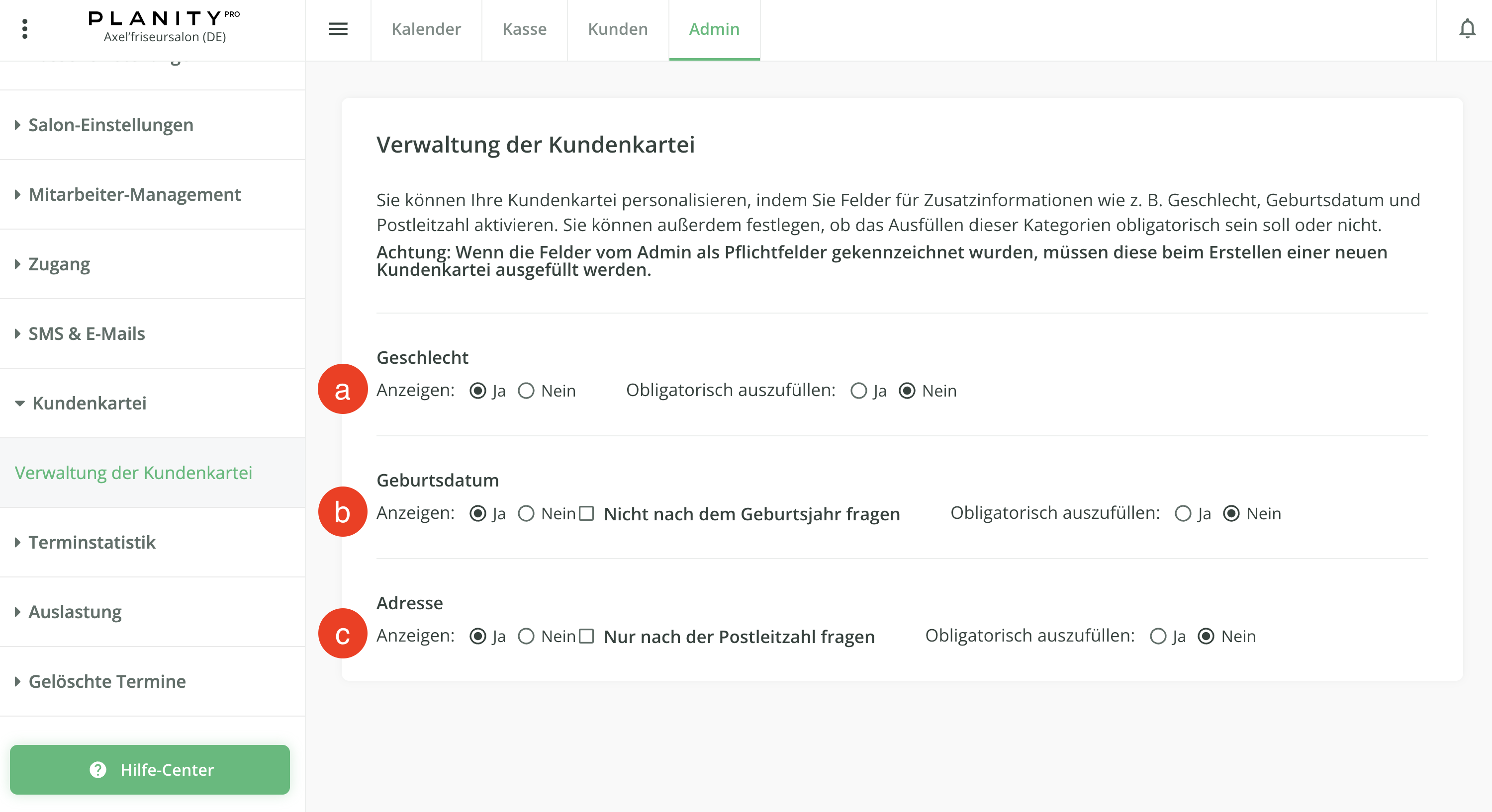 - Um die Kundeninformationen zu bearbeiten und festzulegen, ob die Eingabe erforderlich ist oder nicht, klicken Sie auf Admin.