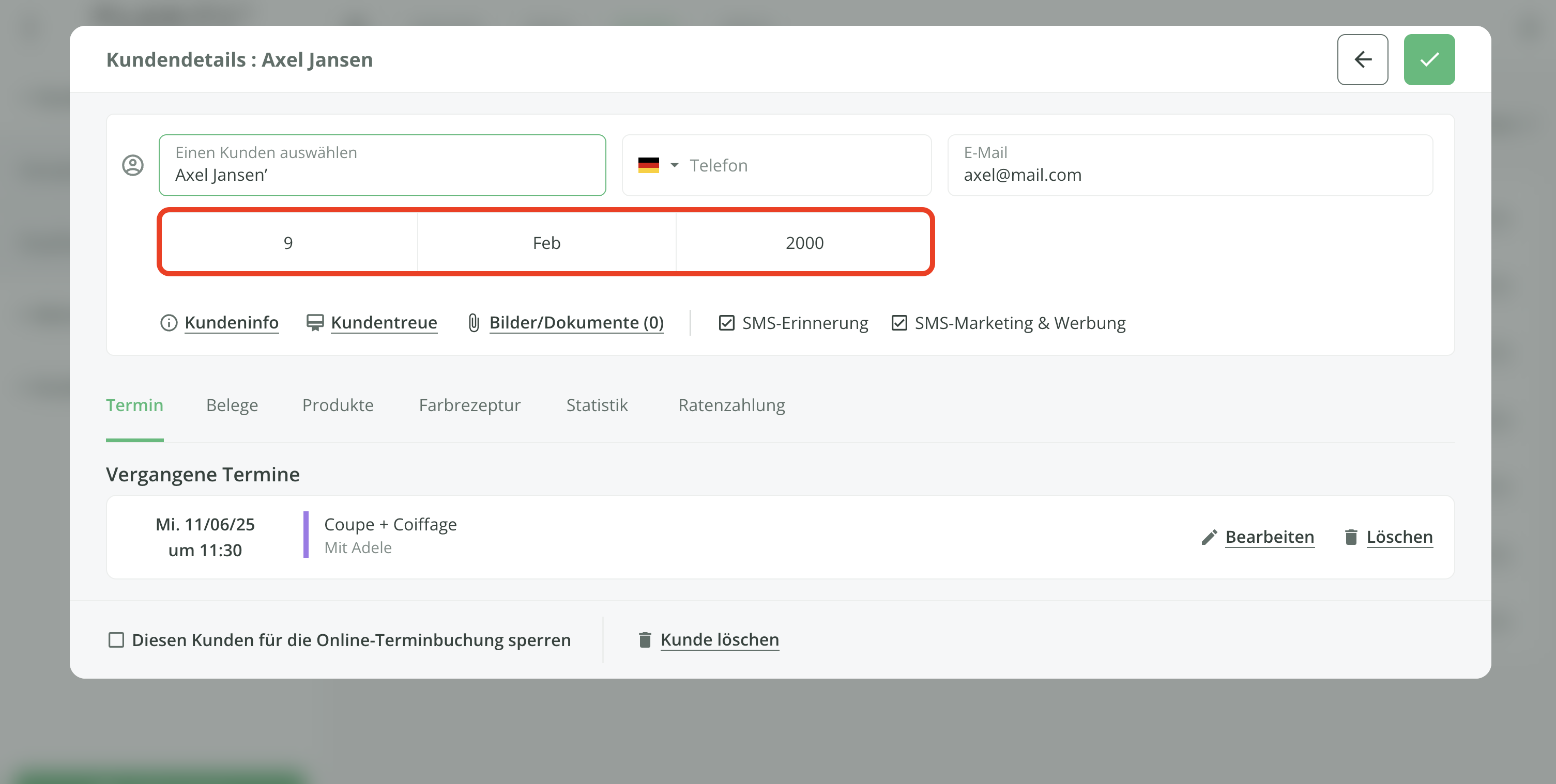 - Das Geburtsdatum des Kunden (Tag, Monat und Jahr oder nur Tag und Monat).