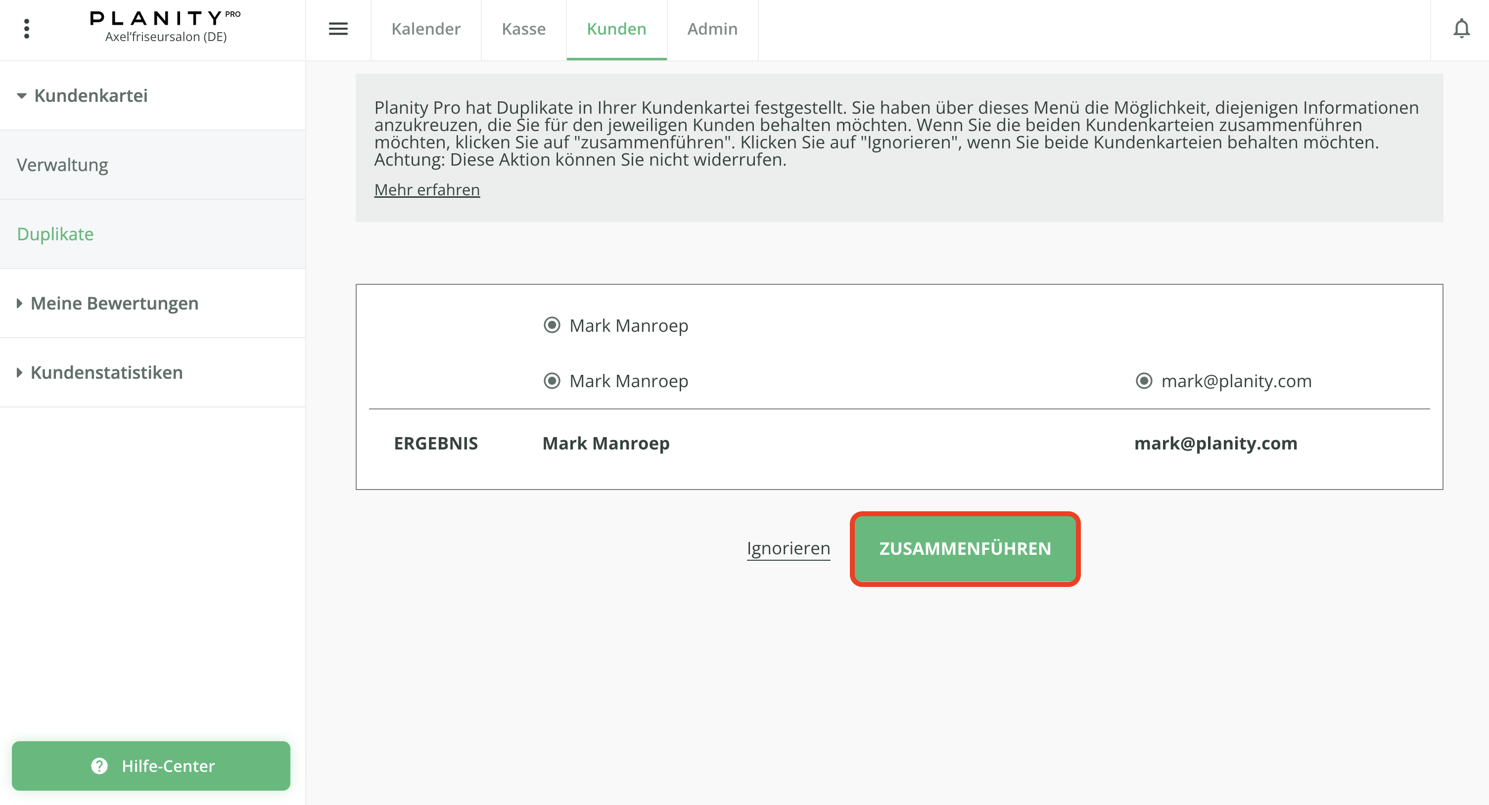 Klicken Sie dazu einfach auf Zusammenführen. Sie können auf der Kundenkartei die gewünschten Informationen beibehalten, indem Sie sie auswählen.