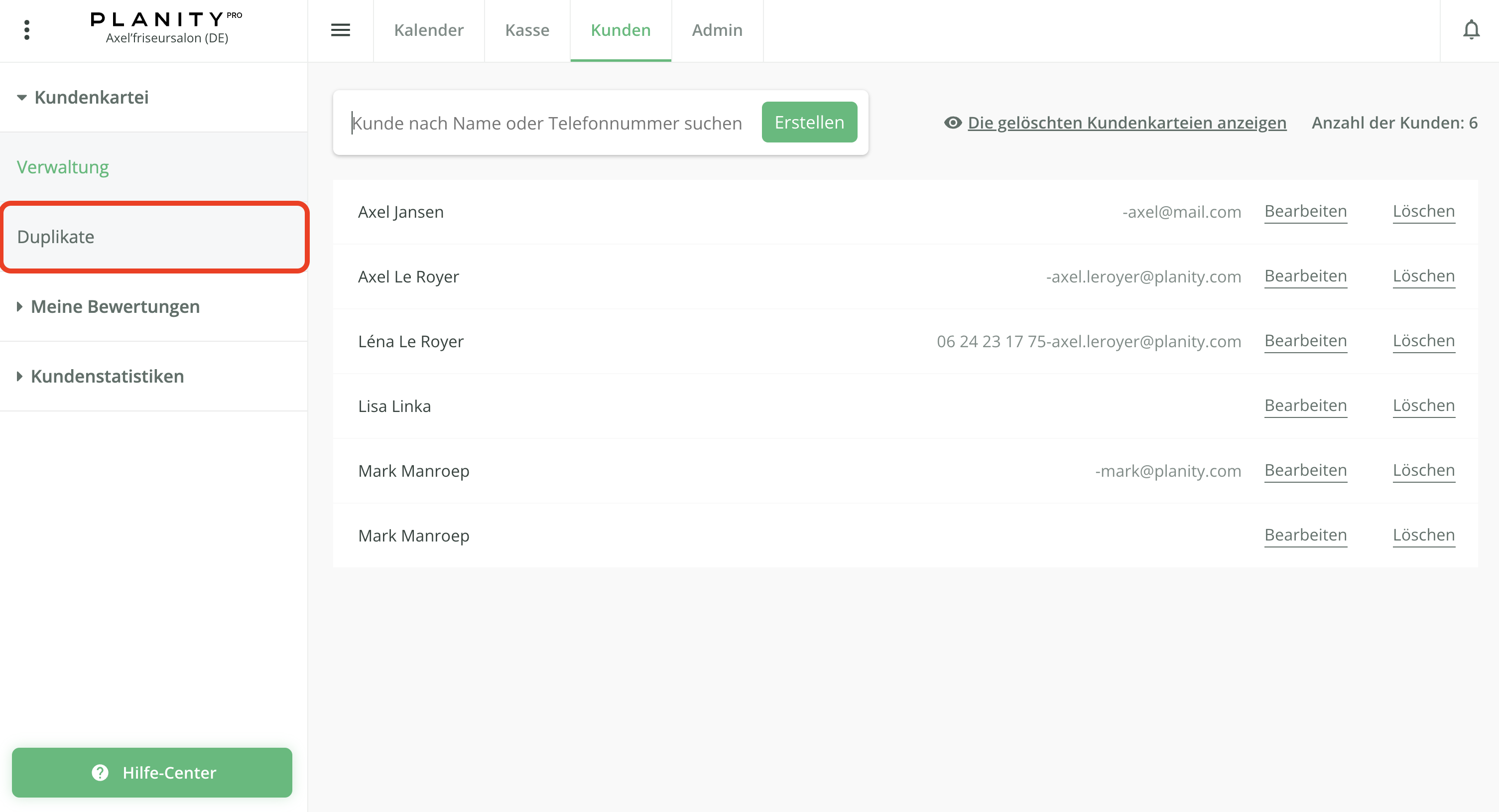 - Auf dieser Registerkarte finden Sie alle Duplikate, d. h. Kundenkarteikarten, die ähnliche Merkmale aufweisen.