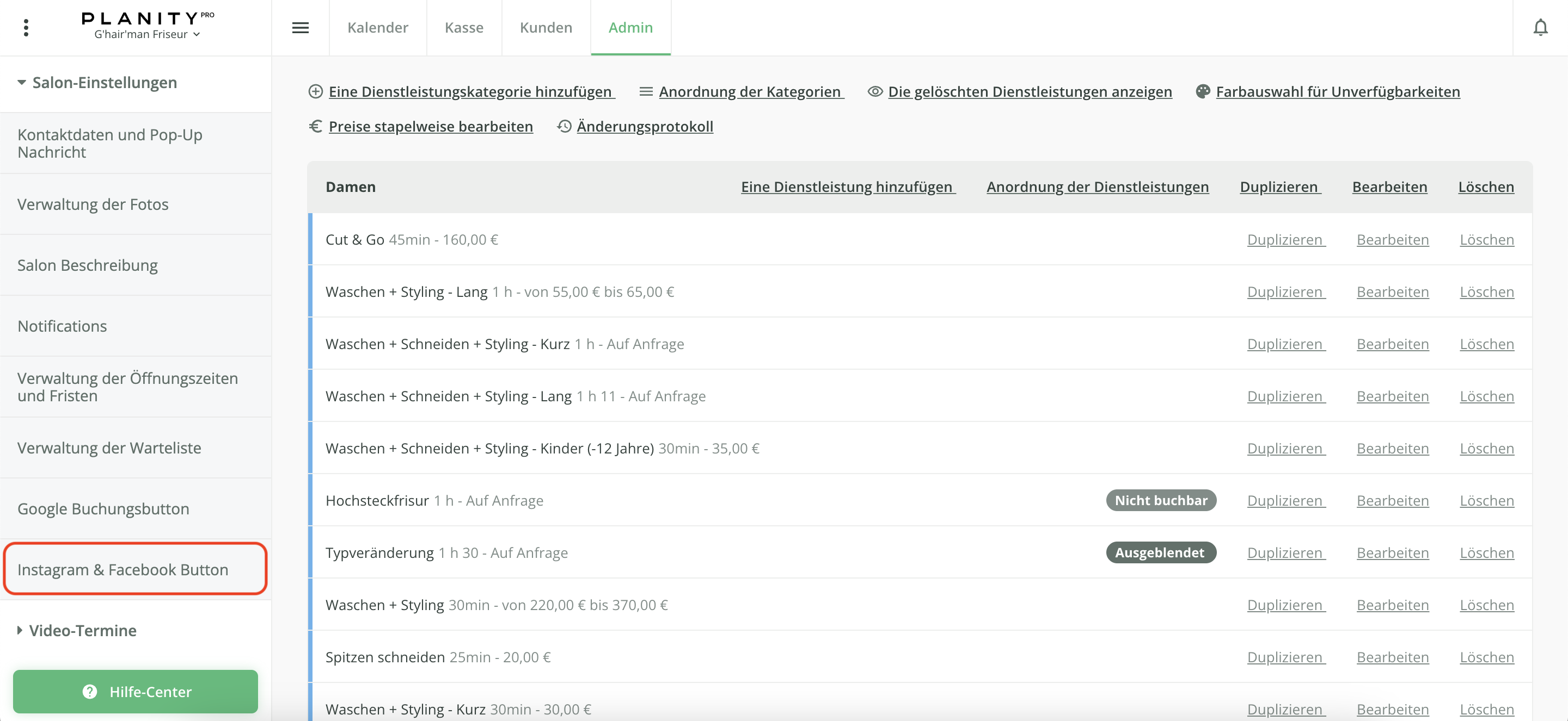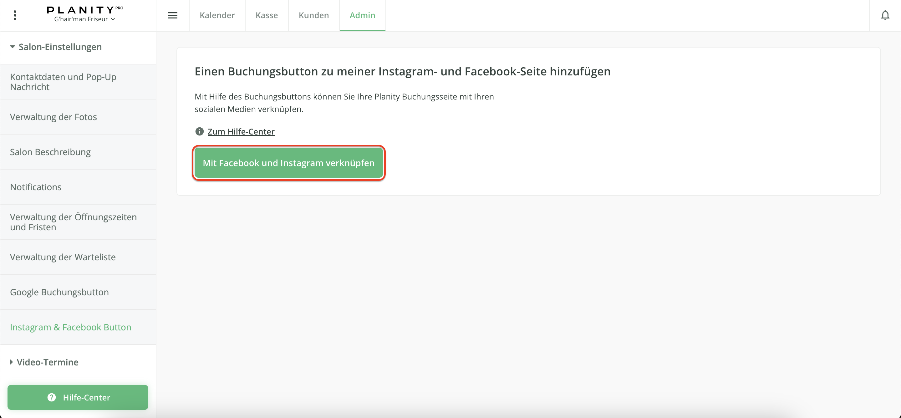 Gehen Sie einfach zurück zu Planity Pro Web, klicken Sie auf Admin, dann auf Salon-Einstellungen und anschließend auf Facebook und Instagram Button. Klicken Sie abschließend auf "Den Instagram- und Facebook-Button löschen". Der Button wird automatisch gelöscht und Sie können ihn z. B. für ein anderes Konto einrichten (falls gewünscht).