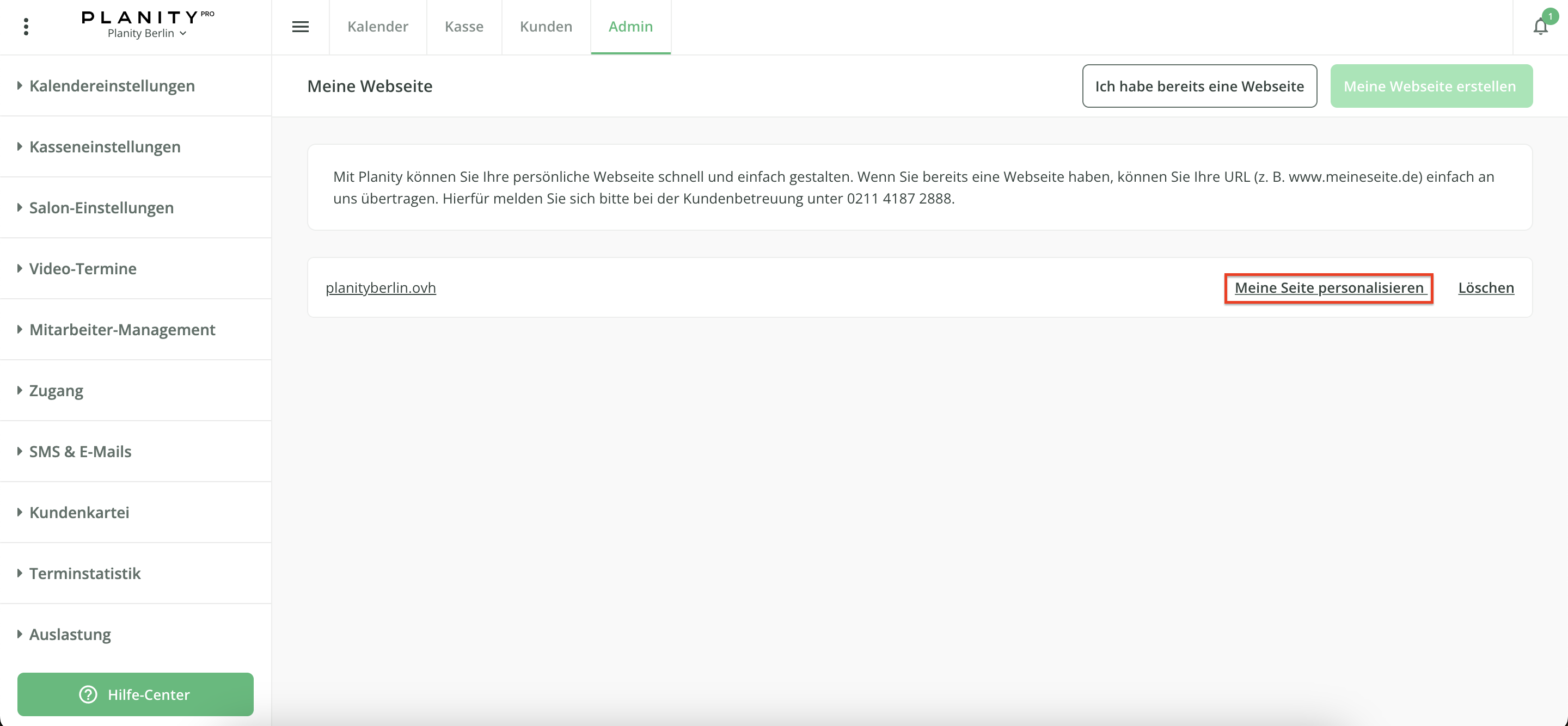 Um die Website zu aktivieren, wenden Sie sich bitte an Ihren Planity-Berater oder klicken Sie auf den Reiter „Meine Website” oben im horizontalen Hauptmenü von Planity Pro.