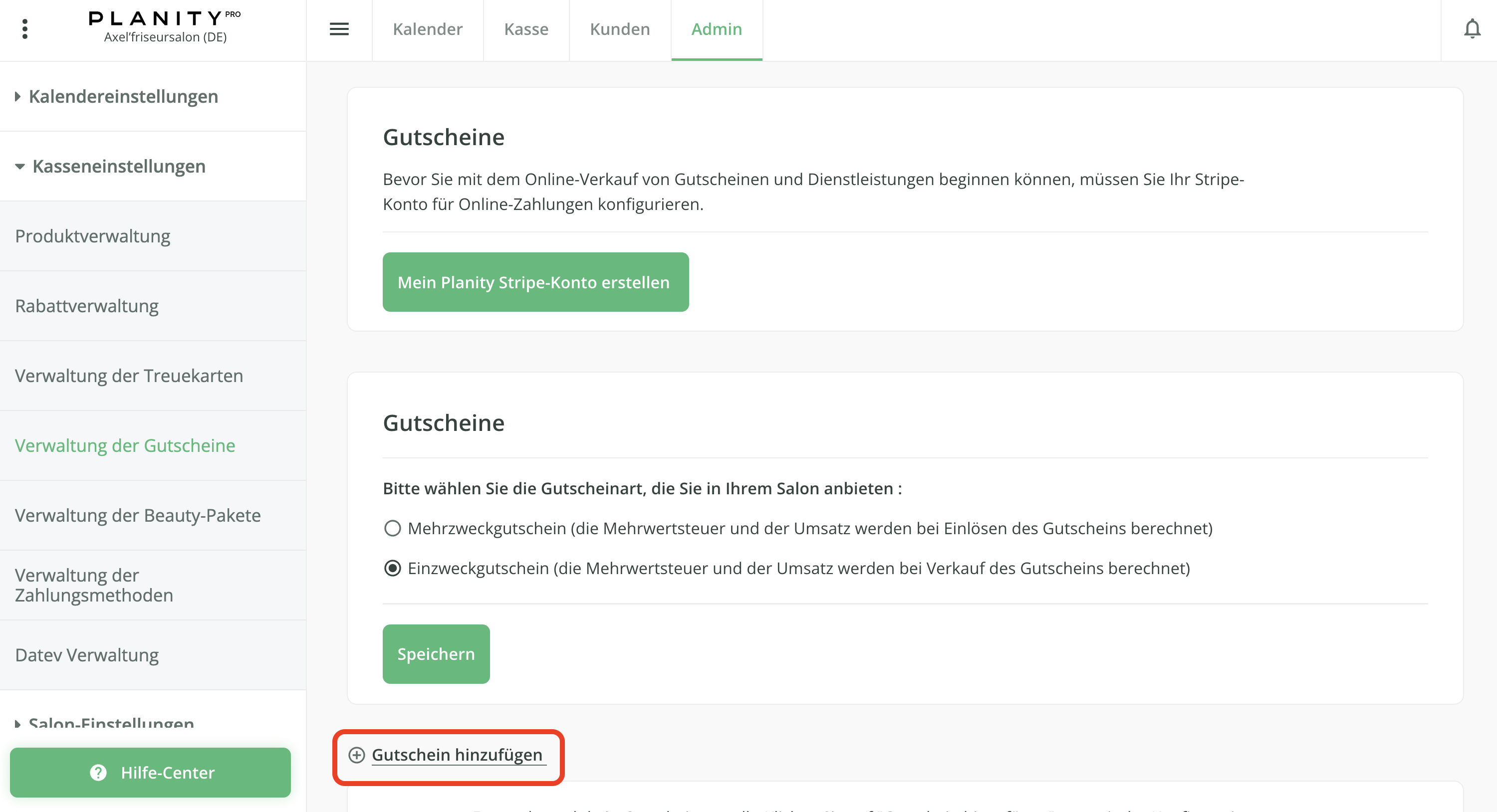 - Um bei der Bezahlung im Geschäft oder beim Online-Verkauf einen verfügbaren Gutschein hinzuzufügen, klicken Sie auf Admin