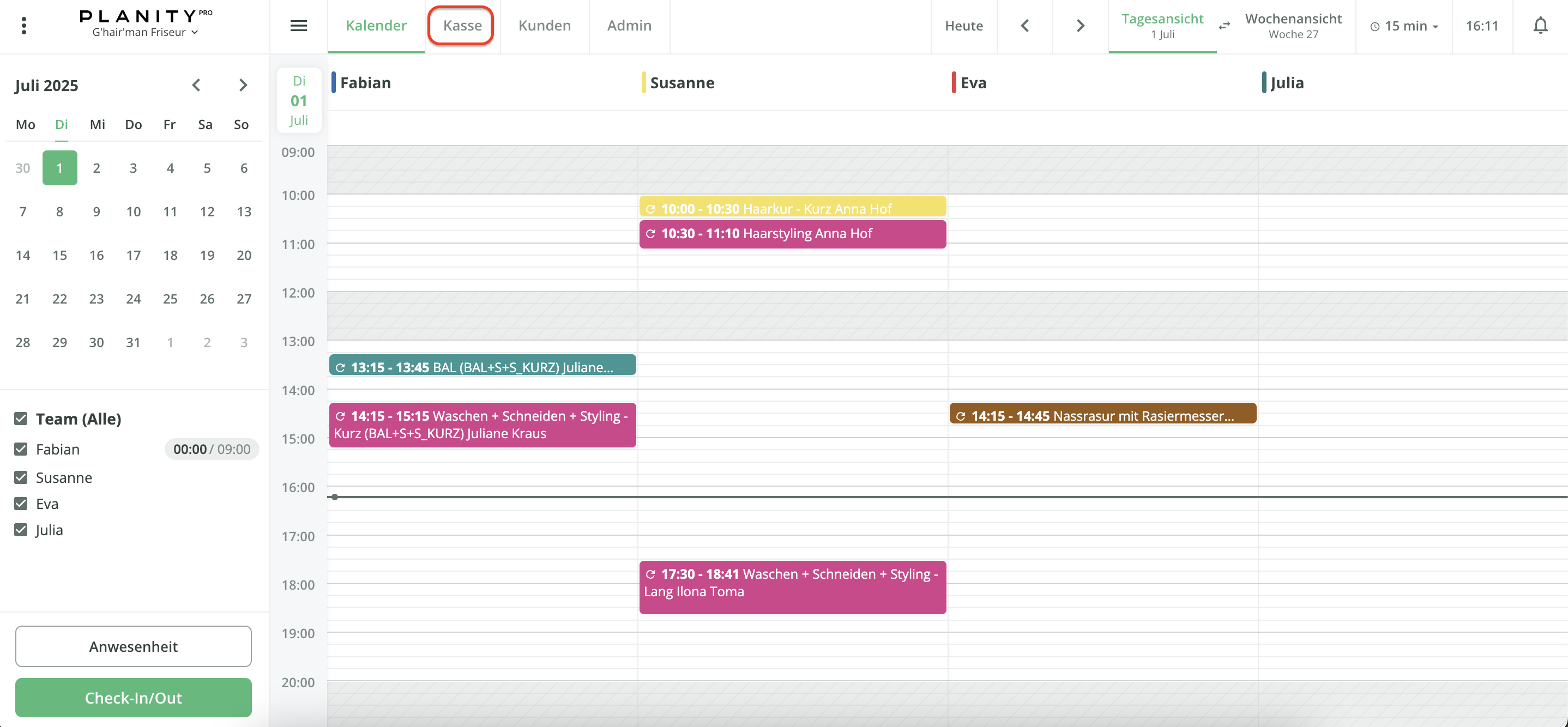 Um die Kasse zu aktivieren, wenden Sie sich bitte an Ihren Planity-Berater oder klicken Sie auf den Reiter „Kasse” oben im horizontalen Hauptmenü von Planity Pro.