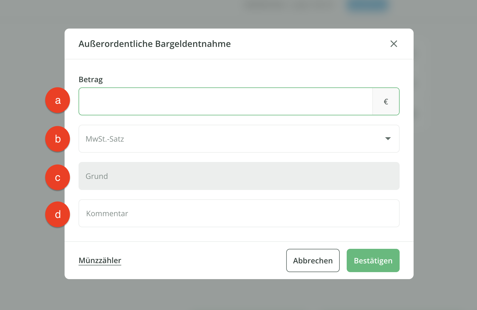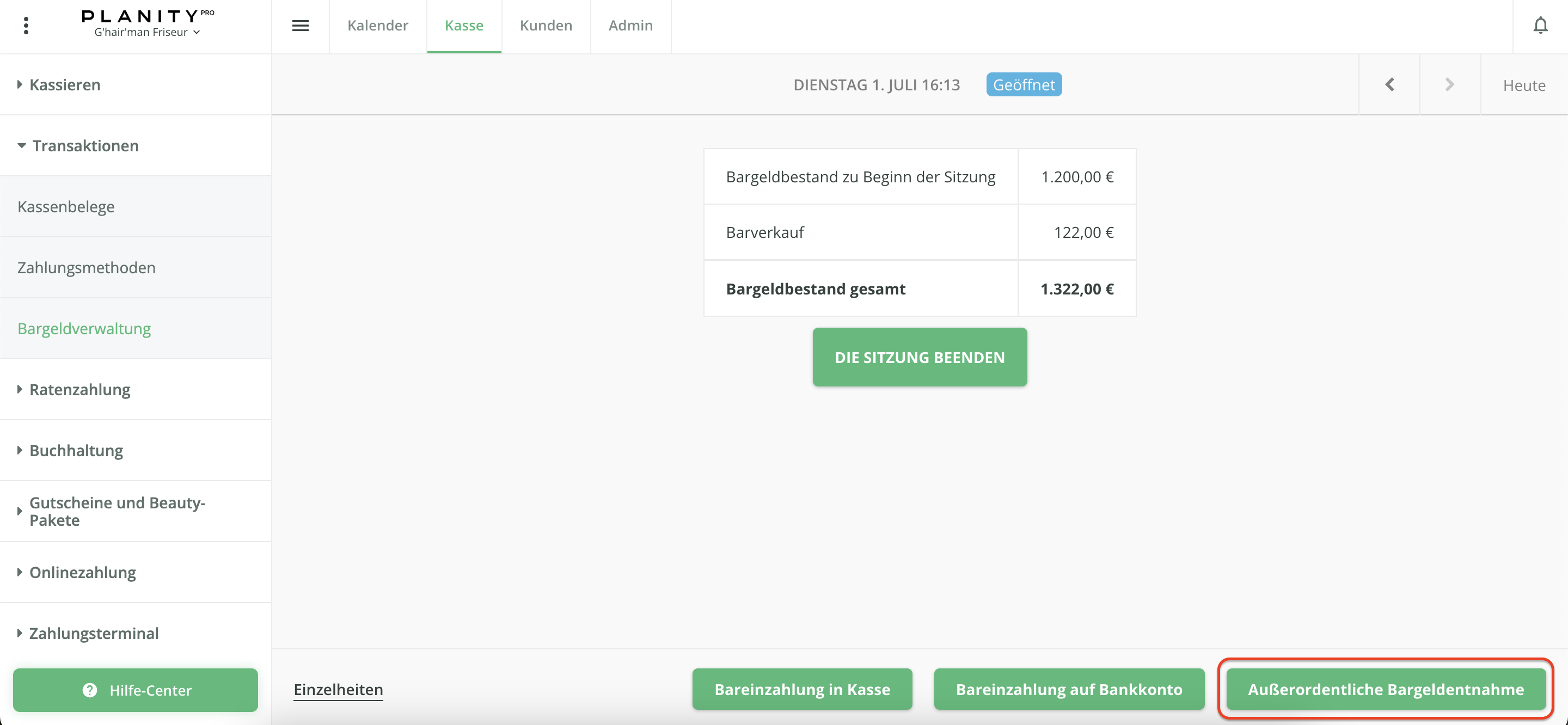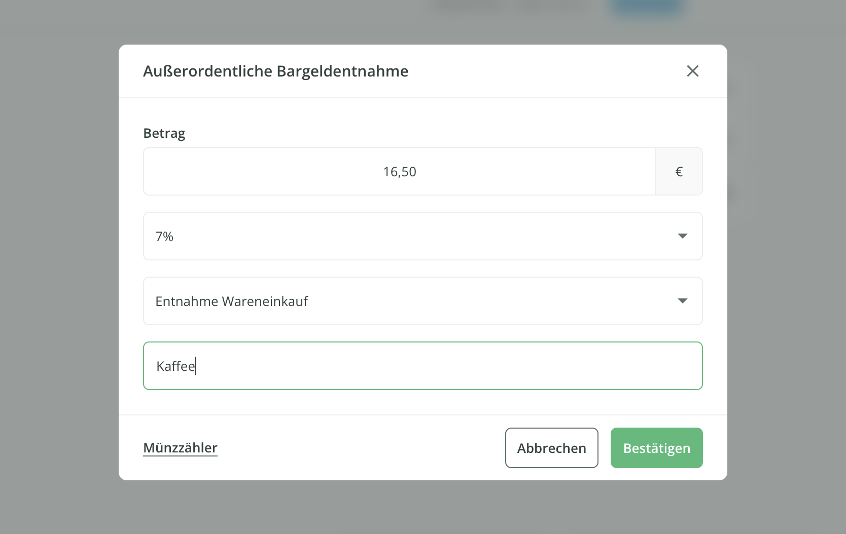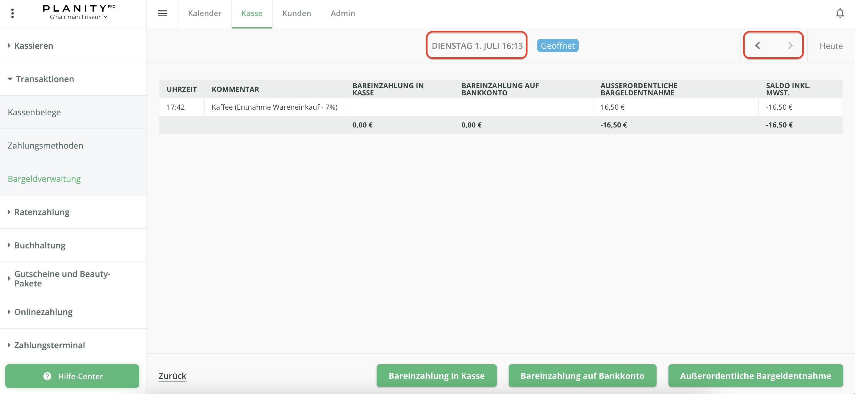 ℹ️ Eine außerordentliche Bargeldentnahme müssen Sie immer dann buchen, wenn Sie Bargeld aus der Kasse entnehmen, um davon z. B. Blumen, Magazine, Kaffee oder Ähnliches für den täglichen Salon Bedarf zu kaufen oder wenn Sie z. B. Trinkgeld in bar an Ihre Mitarbeiter auszahlen.