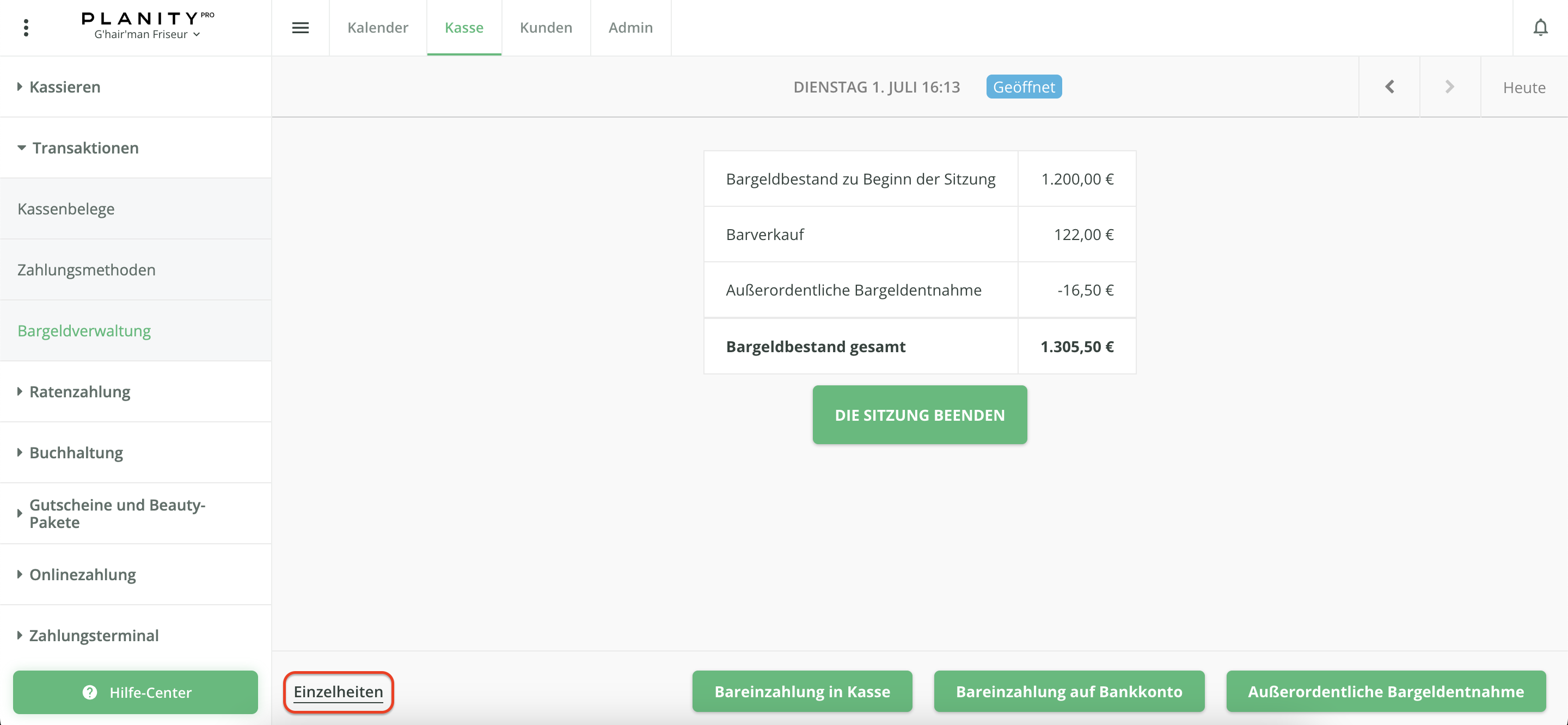 - Klicken Sie unten rechts auf den grünen Button Bestätigen, um den Vorgang zu speichern und das Pop-Up zu schließen. Unten links im Menü Bargeldverwaltung unter Einzelheiten haben Sie die Möglichkeit, alle Bargeldvorgänge der jeweiligen Tagessitzung einzusehen.