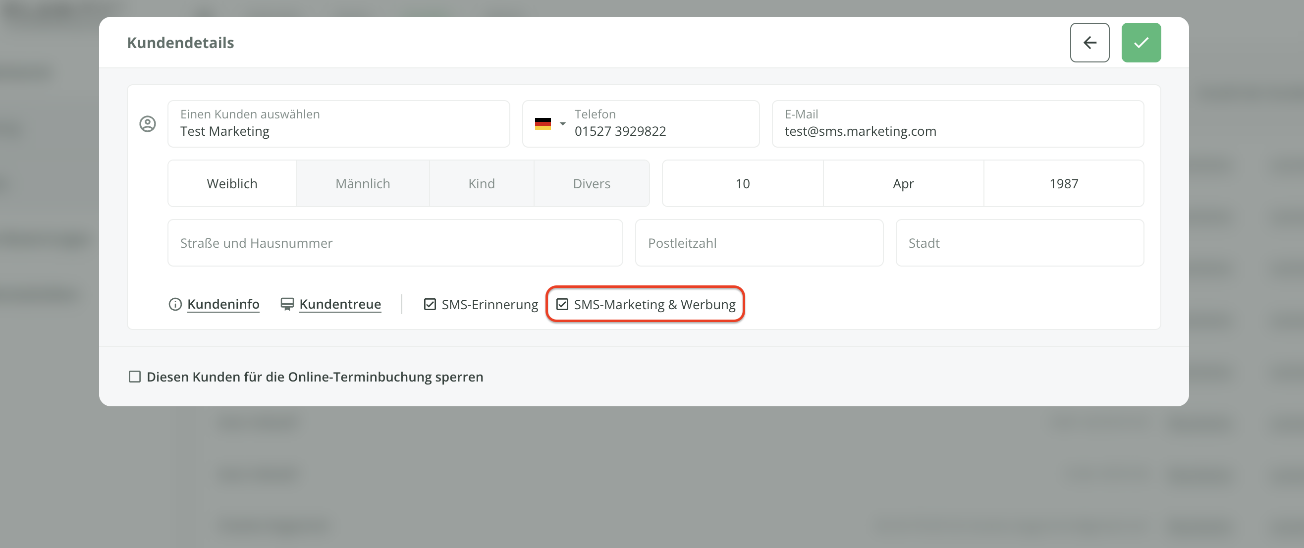 - Fragen Sie Ihre Kunden, ob diese mit dem Erhalt von Werbe-SMS einverstanden sind und vermerken Sie dies anschließend in der Kundenkartei, indem Sie die Checkbox SMS-Marketing und Werbungankreuzen.
