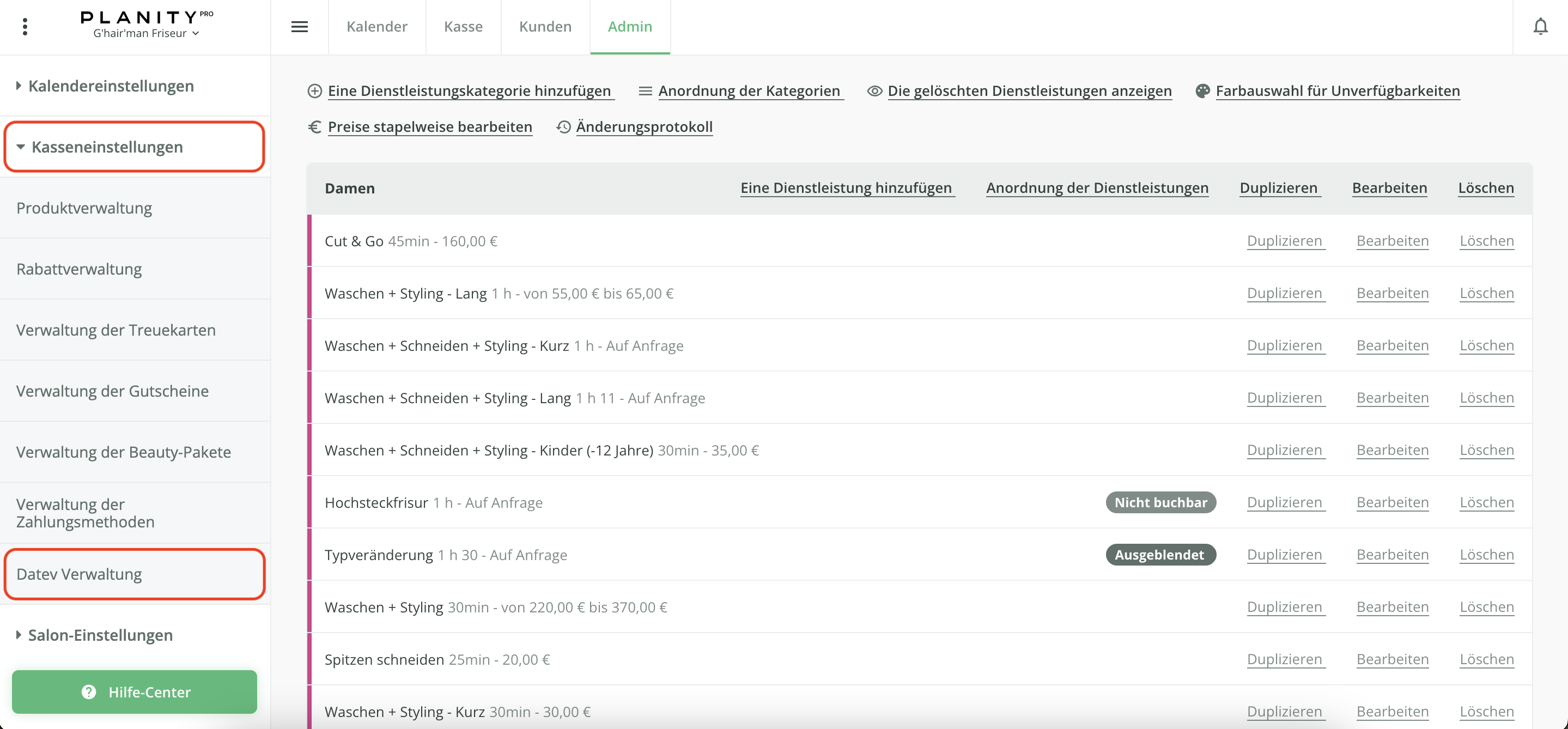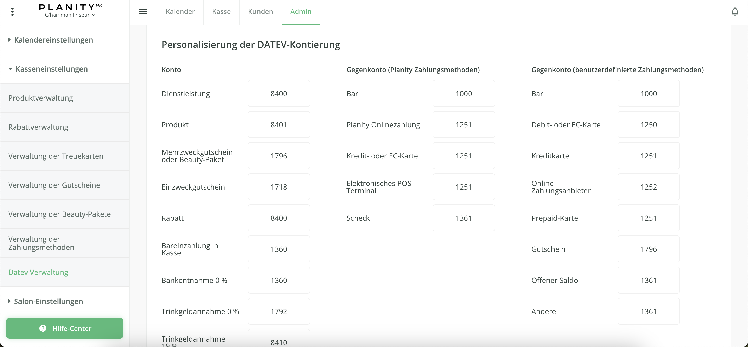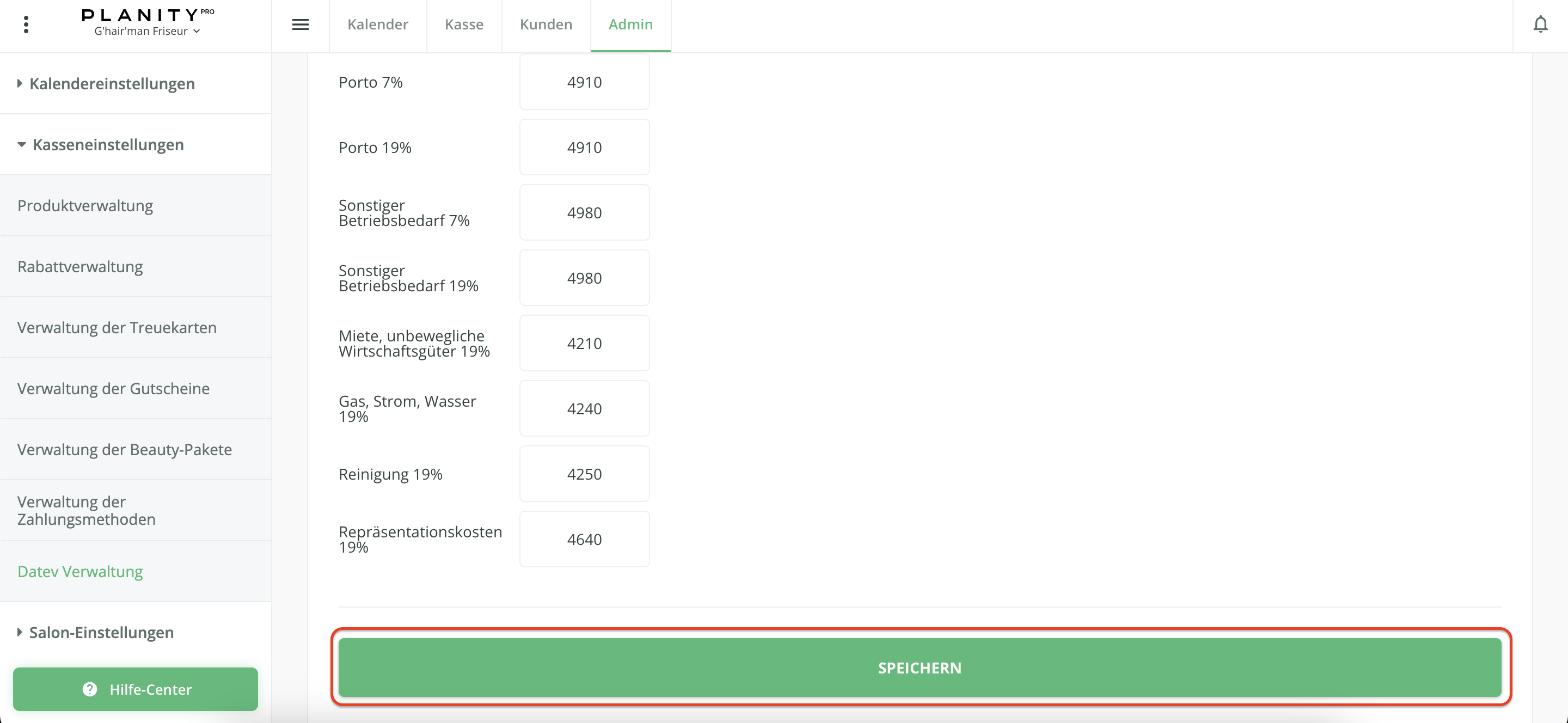 - Klicken Sie anschließend auf Kasseneinstellungen und nun auf das Untermenü DATEV-Verwaltung