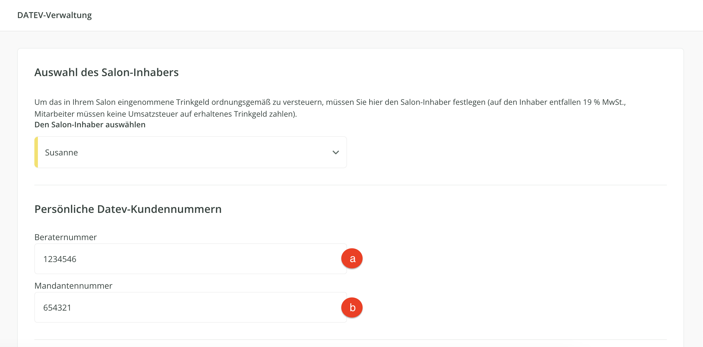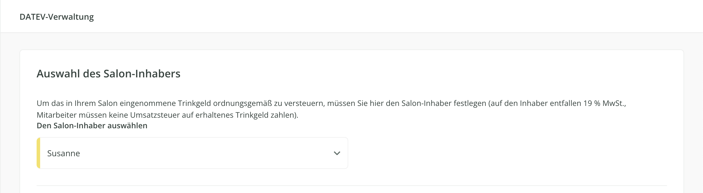 - Sie können den Inhaber bzw. die Inhaberin des Salons auswählen (damit das Trinkgeld ordnungsgemäß mit 19 % besteuert werden kann; Arbeitnehmer müssen keine Mehrwertsteuer auf Trinkgeldeinnahmen zahlen).