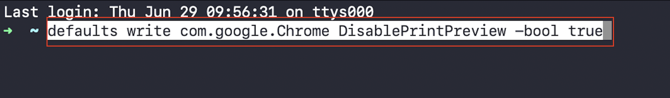 defaults write com.google.Chrome DisablePrintPreview -bool true