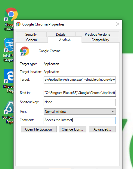 ' -disable-print-preview'im Feld Ziel hinzu, ohne den alten Code zu löschen. Bitte stellen Sie sicher, dass Sie das Leerzeichen vor dem Bindestrich nicht vergessen