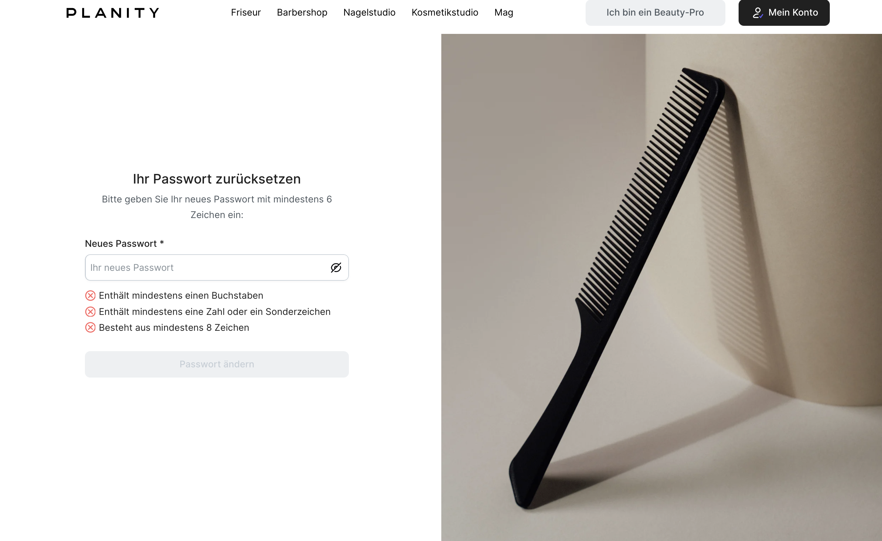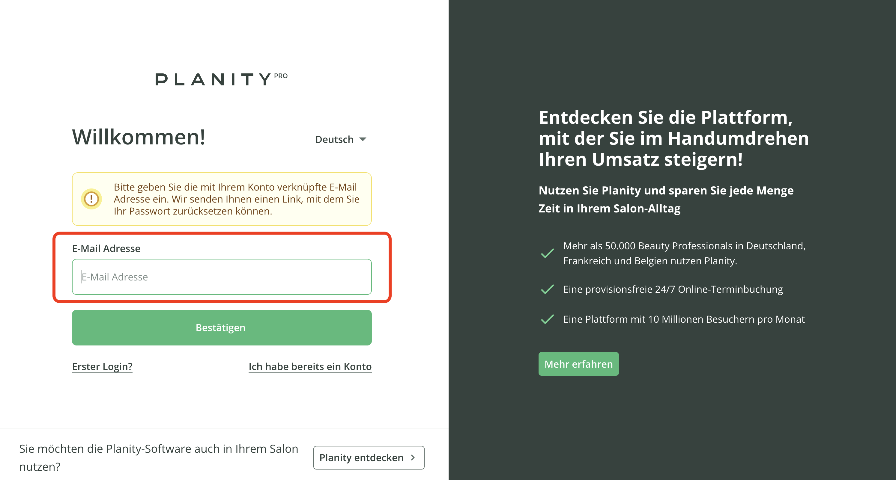- Geben Sie auf der neu geöffneten Seite Ihr neues Passwort ein, um sich bei Planity Pro anzumelden.