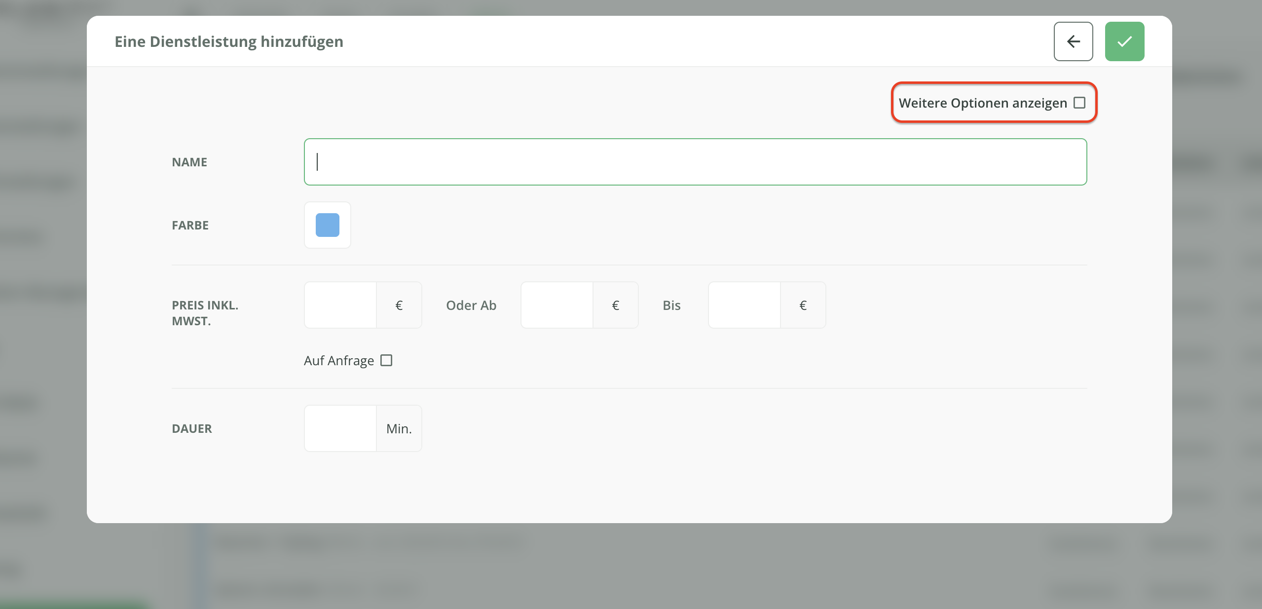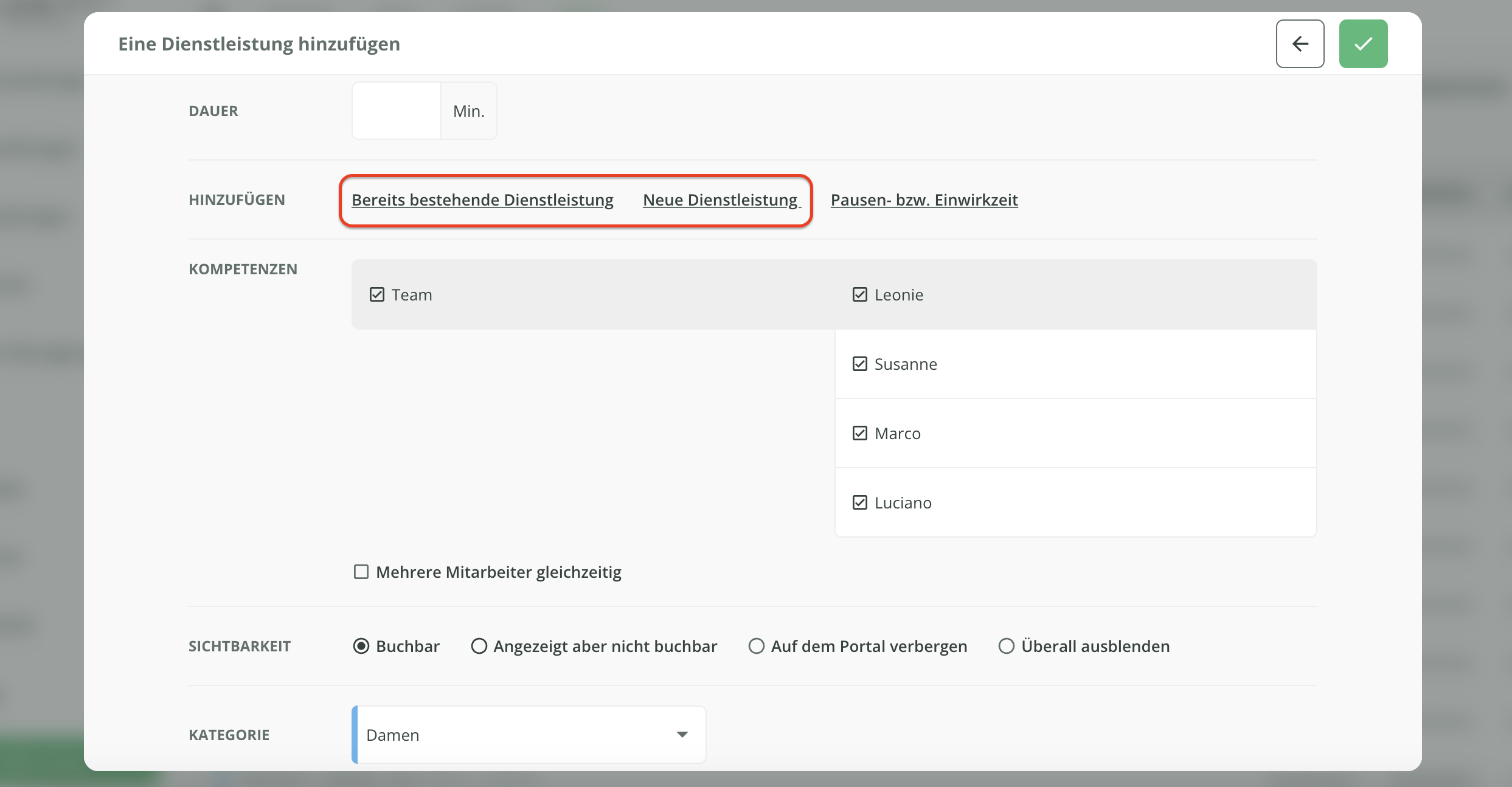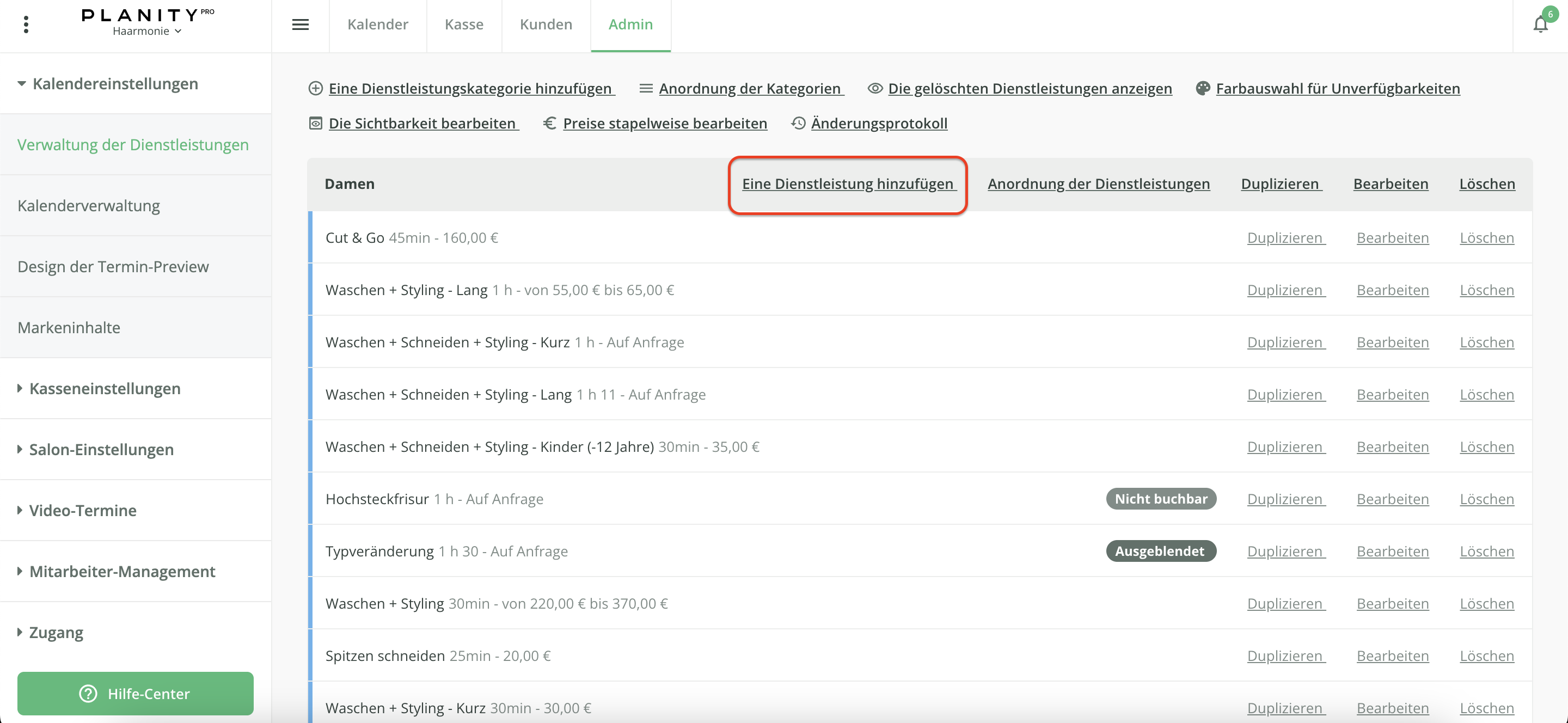 Klicken Sie im Reiter Admin > Kalendereinstellungen in der von Ihnen gewünschten Kategorie auf Dienstleistung hinzufügen.