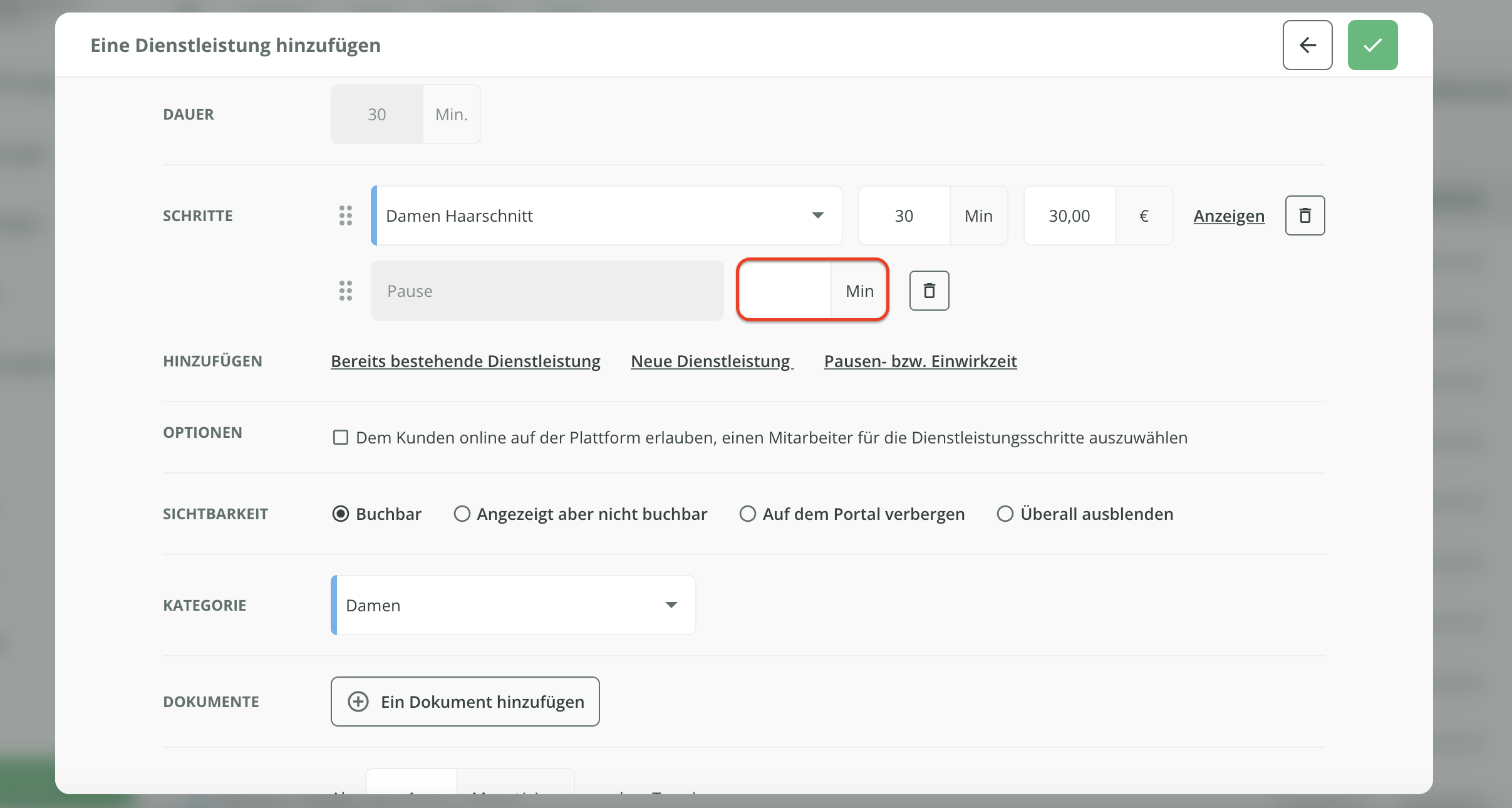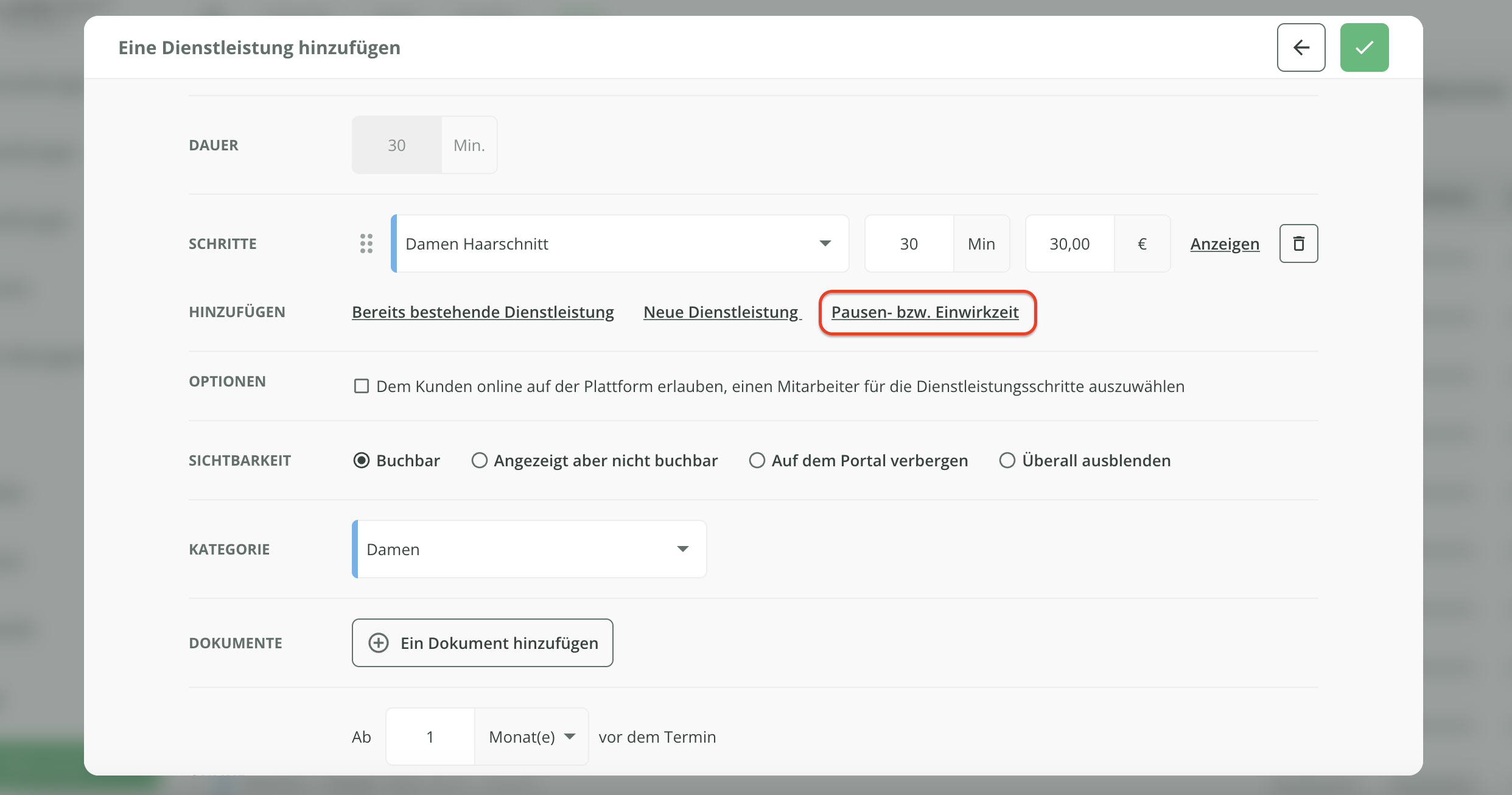 Fügen Sie anschließend eine Pausen- bzw. Einwirkzeit zwischen den Dienstleistungen hinzu.