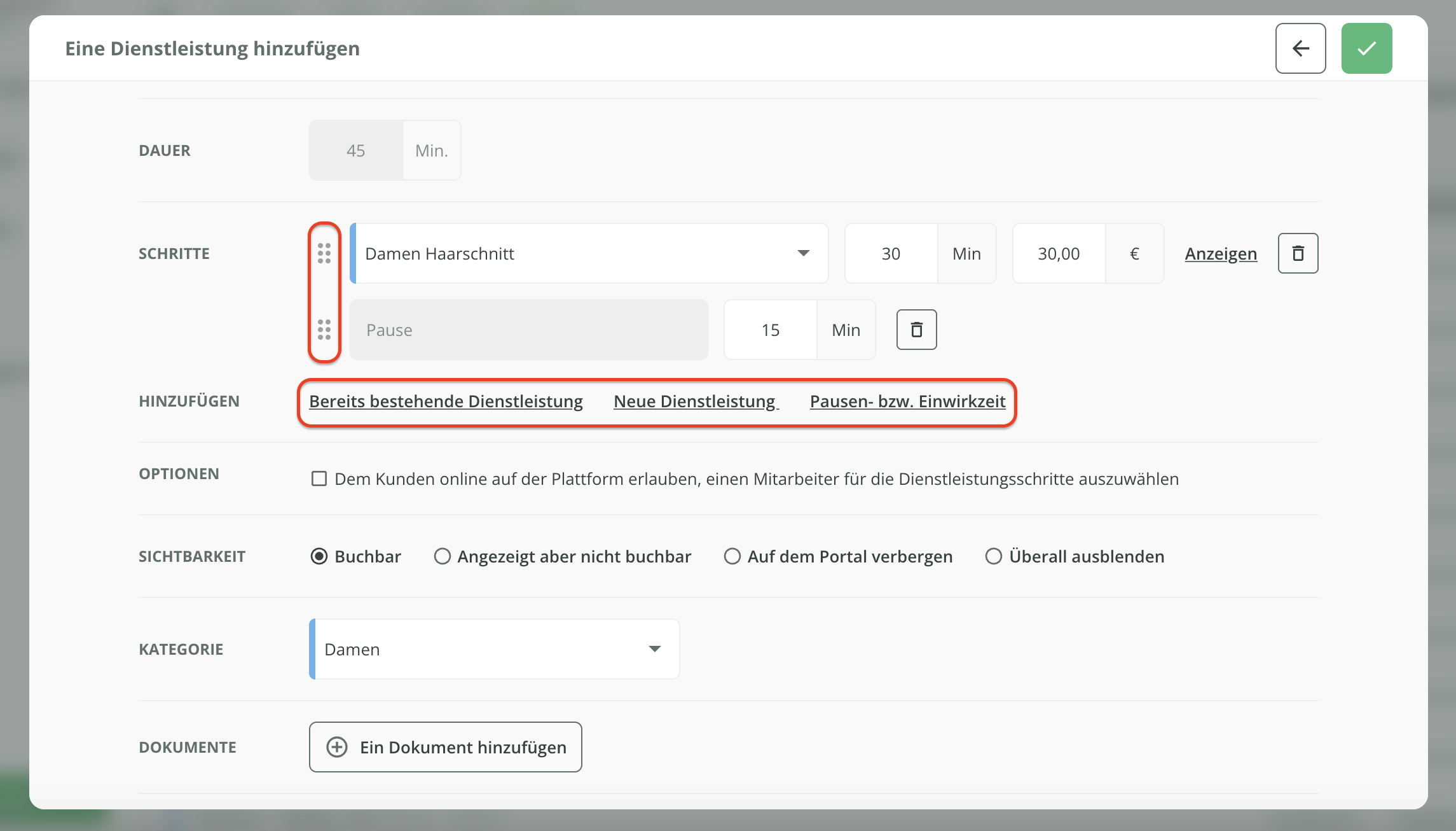 Fügen Sie alle gewünschten Dienstleistung/Pausen hinzu und ordnen Sie die Schritte des Dienstleistungspakets bei Bedarf neu an.