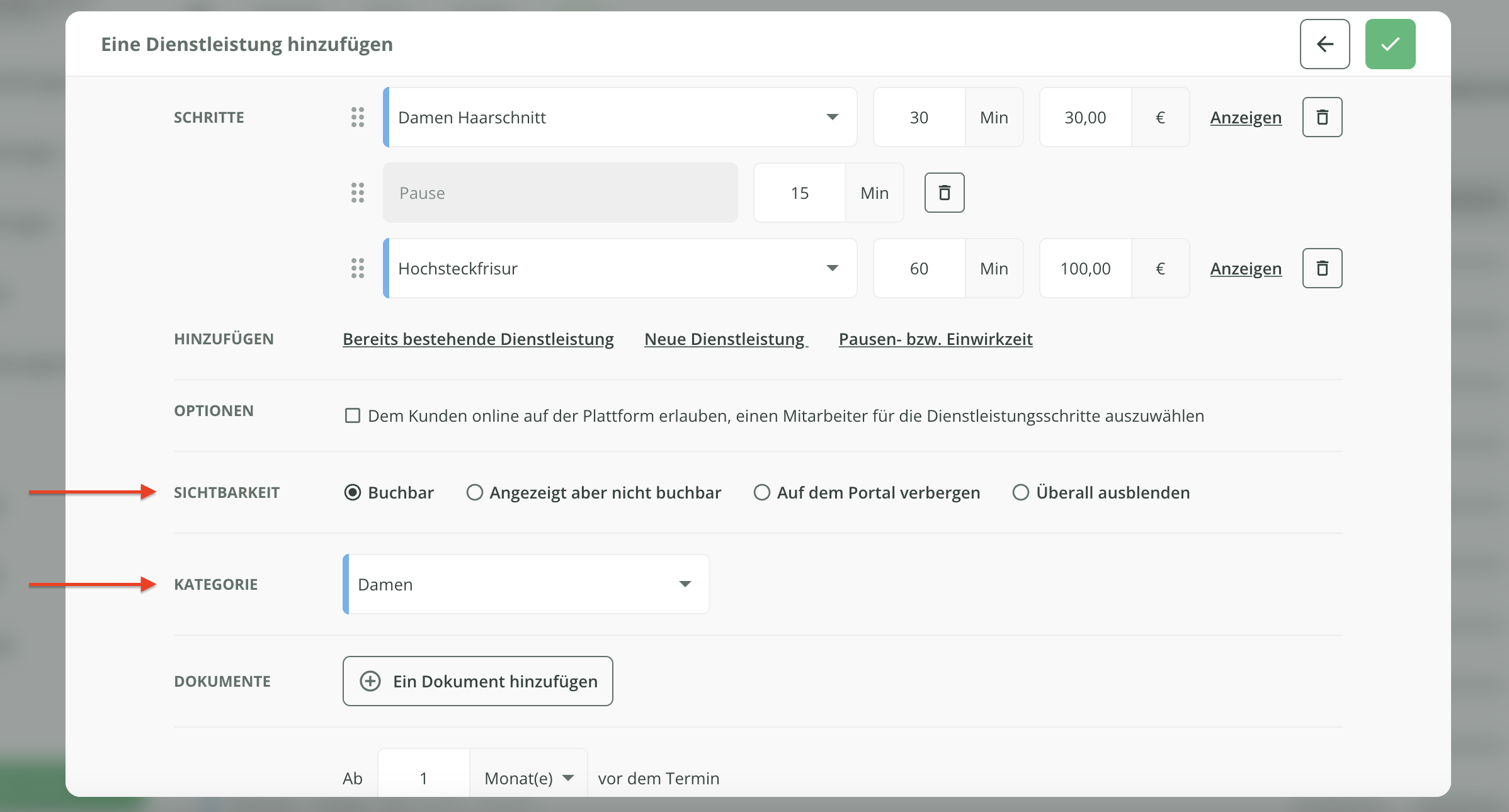 Vergessen Sie nicht, die Sichtbarkeit und die Kategorie für Ihr Dienstleistungspaket auszuwählen.