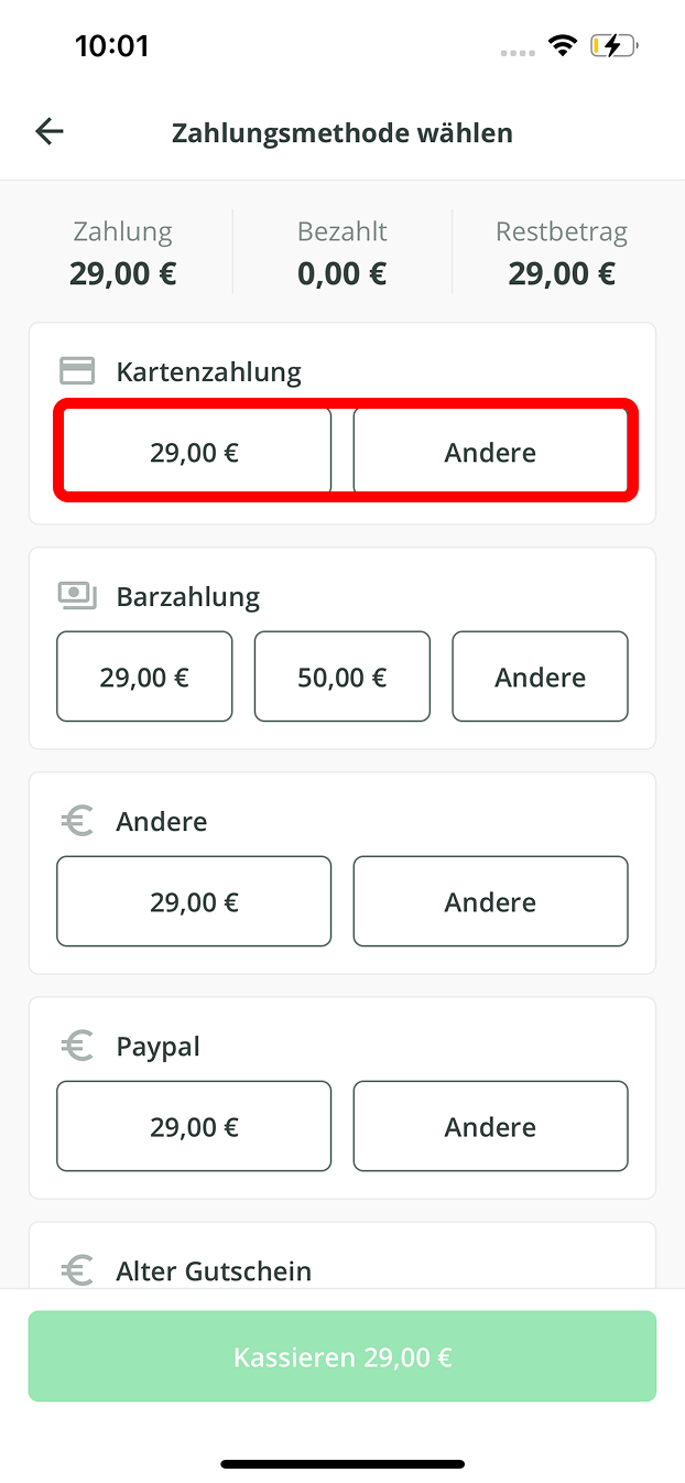 - Wählen Sie dann durch Tippen auf den Betrag eine Zahlungsart aus. Sie können auch mehrere auswählen, z. B. indem Sie auf Andere tippen und dann den gewünschten Betrag für diese Zahlungsart auswählen.