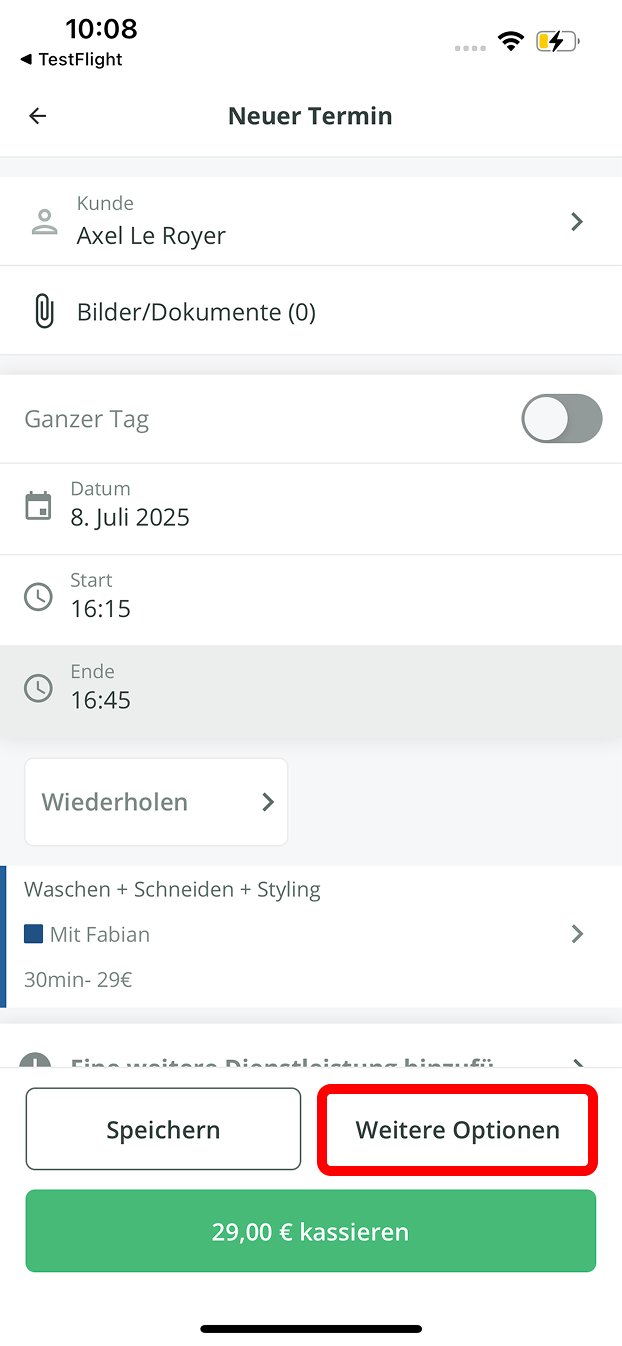 - Um eine weitere Option zu Ihrem Termin hinzuzufügen, tippen Sie auf die Schaltfläche Weitere Optionen.