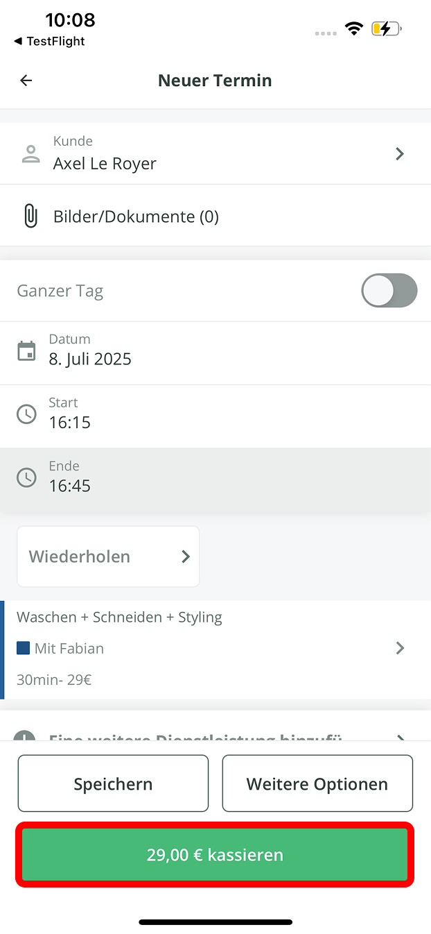 - Überprüfen Sie, ob die Informationen richtig sind: Kundeninformationen, betroffene(r) Mitarbeiter(in), Leistungen, Preis und drücken Sie dann auf Kassieren.
