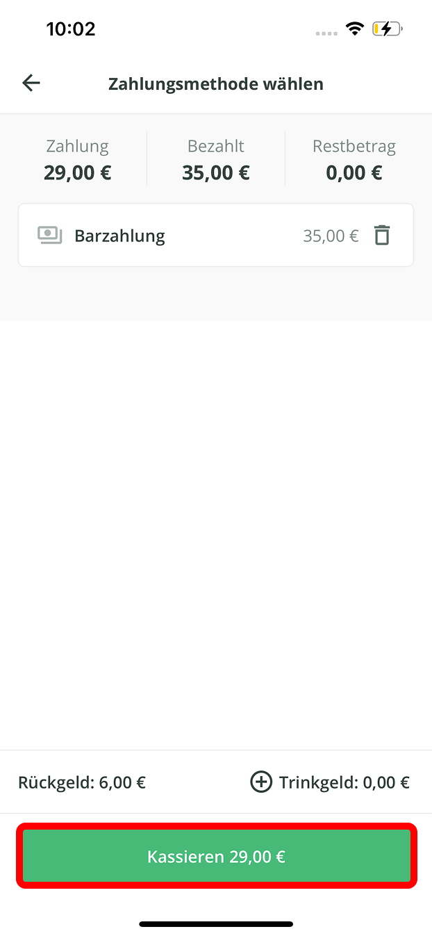 Abschließend müssen Sie noch auf „Kassieren“ tippen.