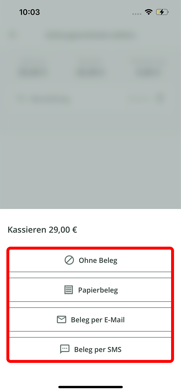 - Schließen Sie die Zahlung ab, geben Sie die Versandart des Kassenbelegs ein.