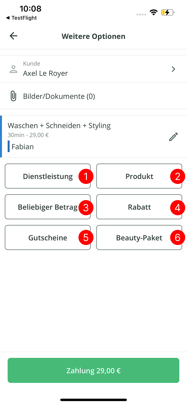 - Wenn Sie alles hinzugefügt haben, können Sie auf „Bezahlen“ klicken und dann das übliche Kassieren abschließen, indem Sie das Zahlungsmittel auswählen und dann die Art und Weise, wie Sie den Kassenbeleg versenden möchten (siehe Erklärungen oben).