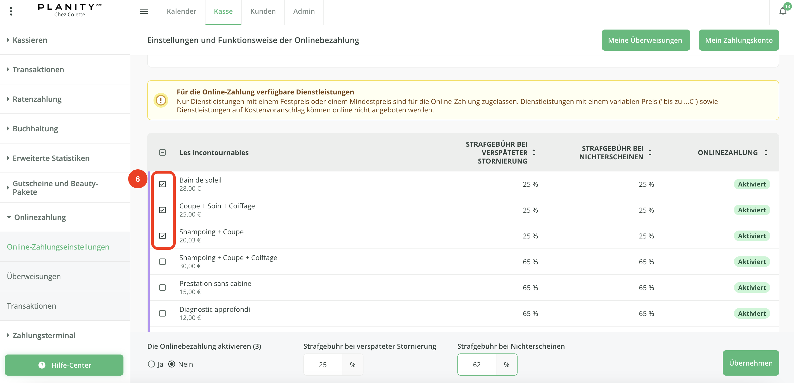 Sobald die Vorauszahlung aktiviert ist, können Sie dann die Vorauszahlung für Online-Buchungen auf alle oder einige der Leistungen aktivieren. Gehen Sie wie folgt vor: