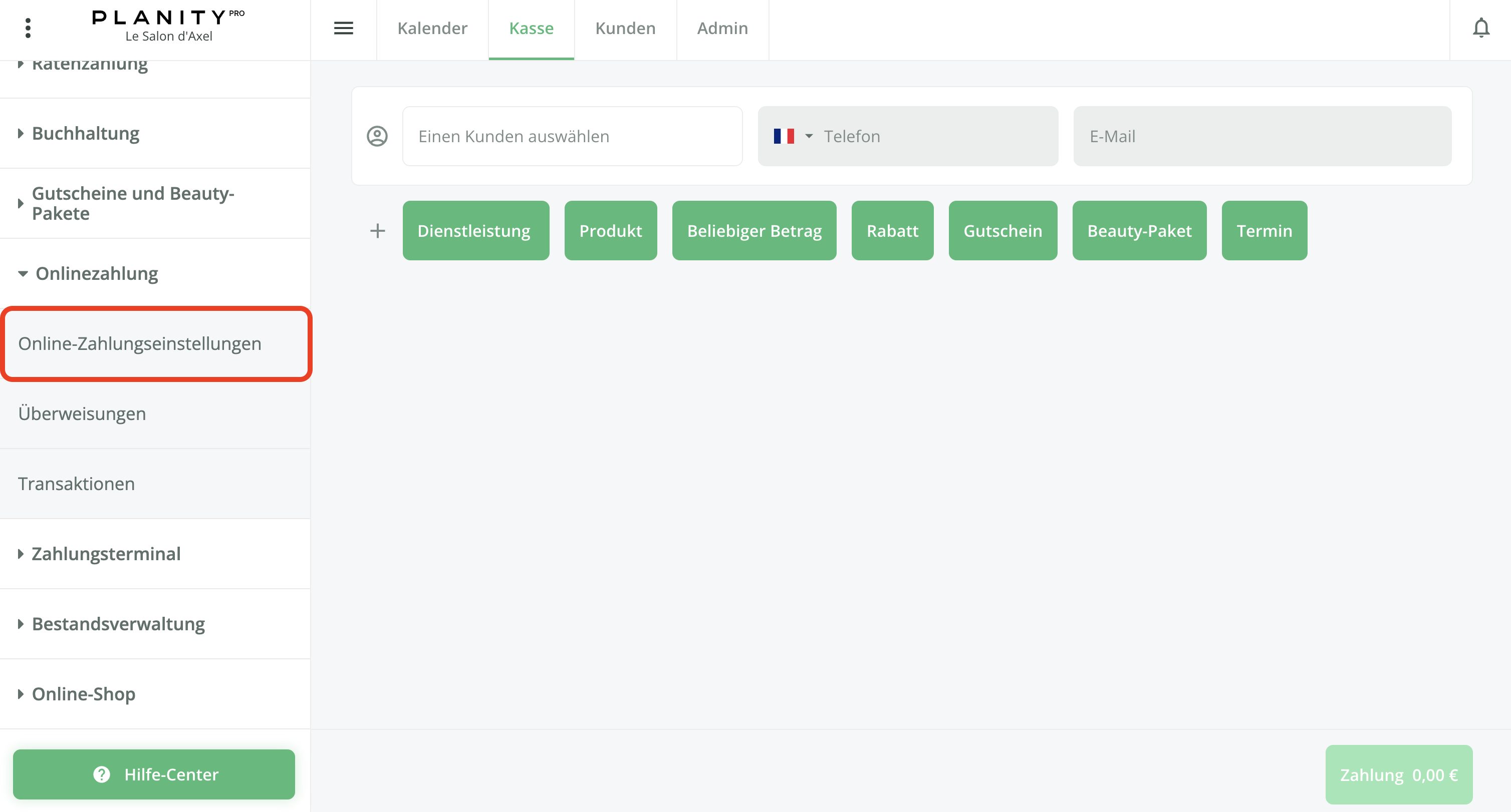 - Wählen Sie auf der linken Seite Ihres Bildschirms das Menü „Onlinezahlung“ und dann die Seite „Online-Zahlungseinstellungen“.