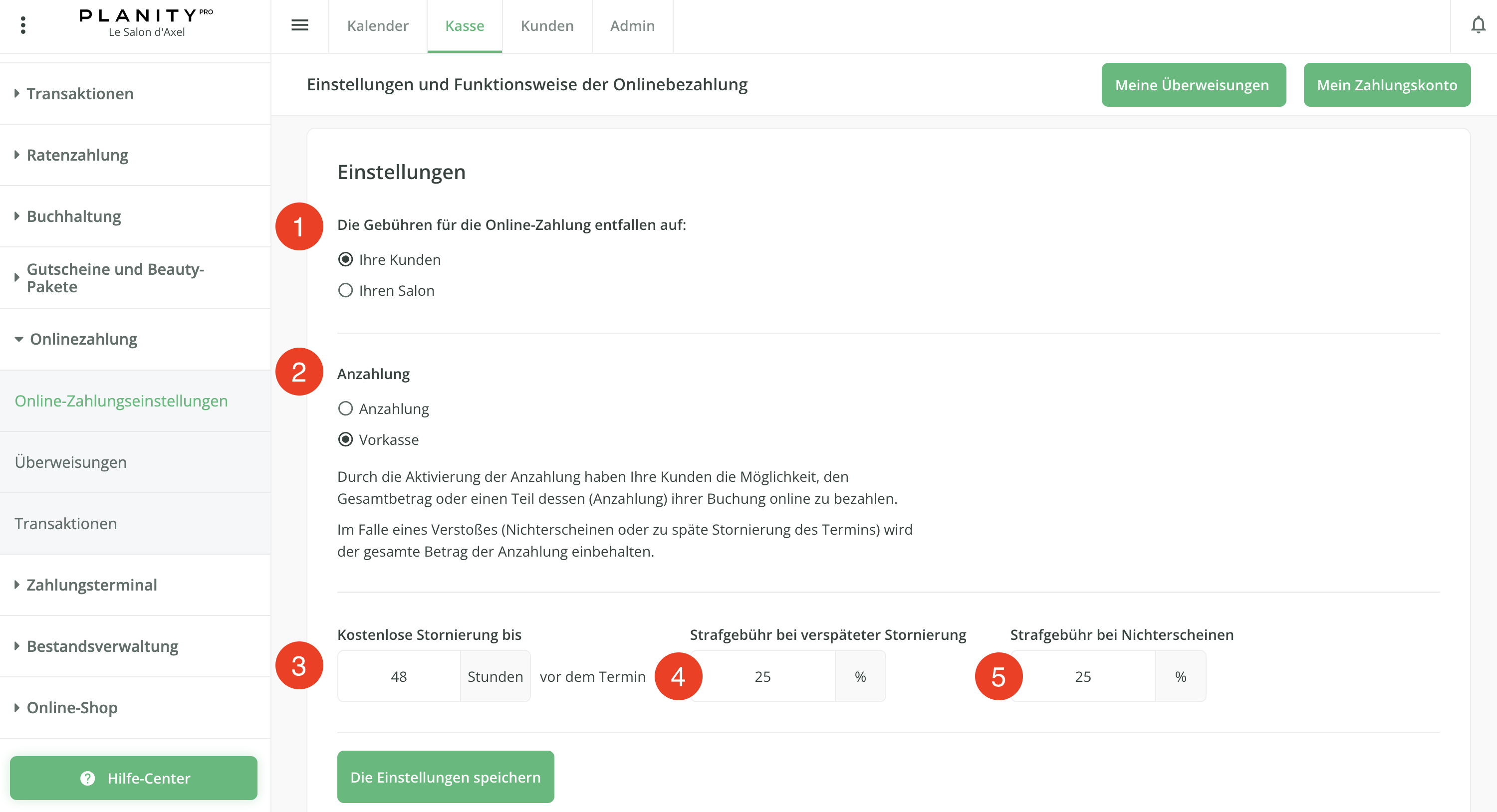 - Wählen Sie zunächst aus, ob Sie die Gebühren für die Online-Zahlung selbst tragen (von Ihrem Salongezahlte Gebühren) oder ob Sie sie vom Kunden zahlen lassen (von Ihren Kunden gezahlte Gebühren, auch als nutzerseitige Bankgebühren bezeichnet).
