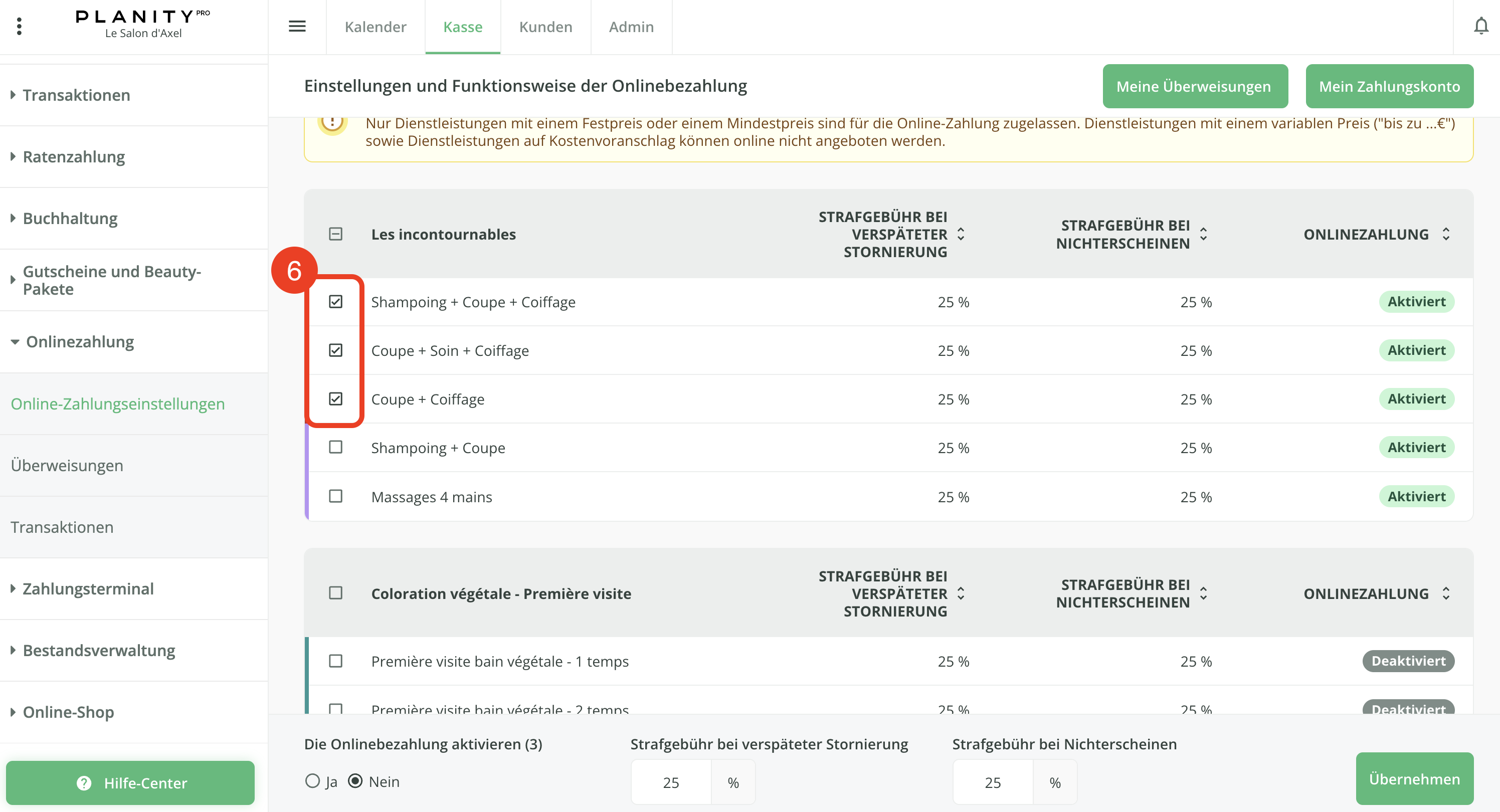Sobald die Vorauszahlung aktiviert ist, können Sie dann die Vorauszahlung für Online-Buchungen auf alle oder einige der Leistungen aktivieren. Gehen Sie wie folgt vor: