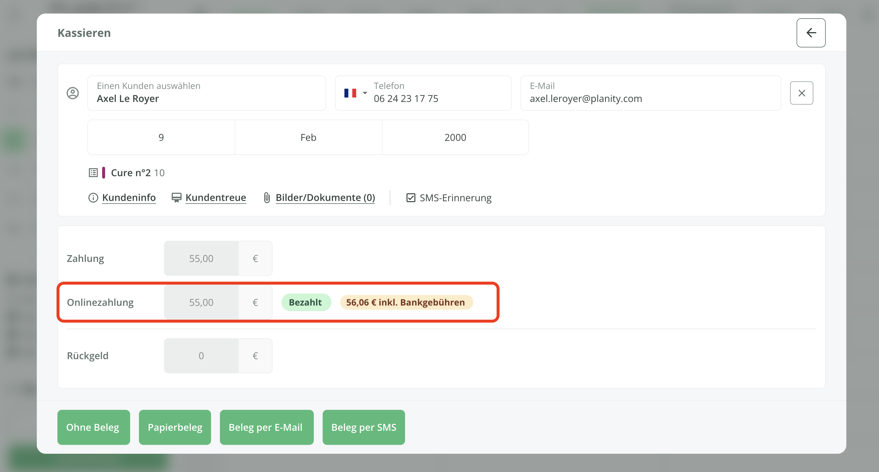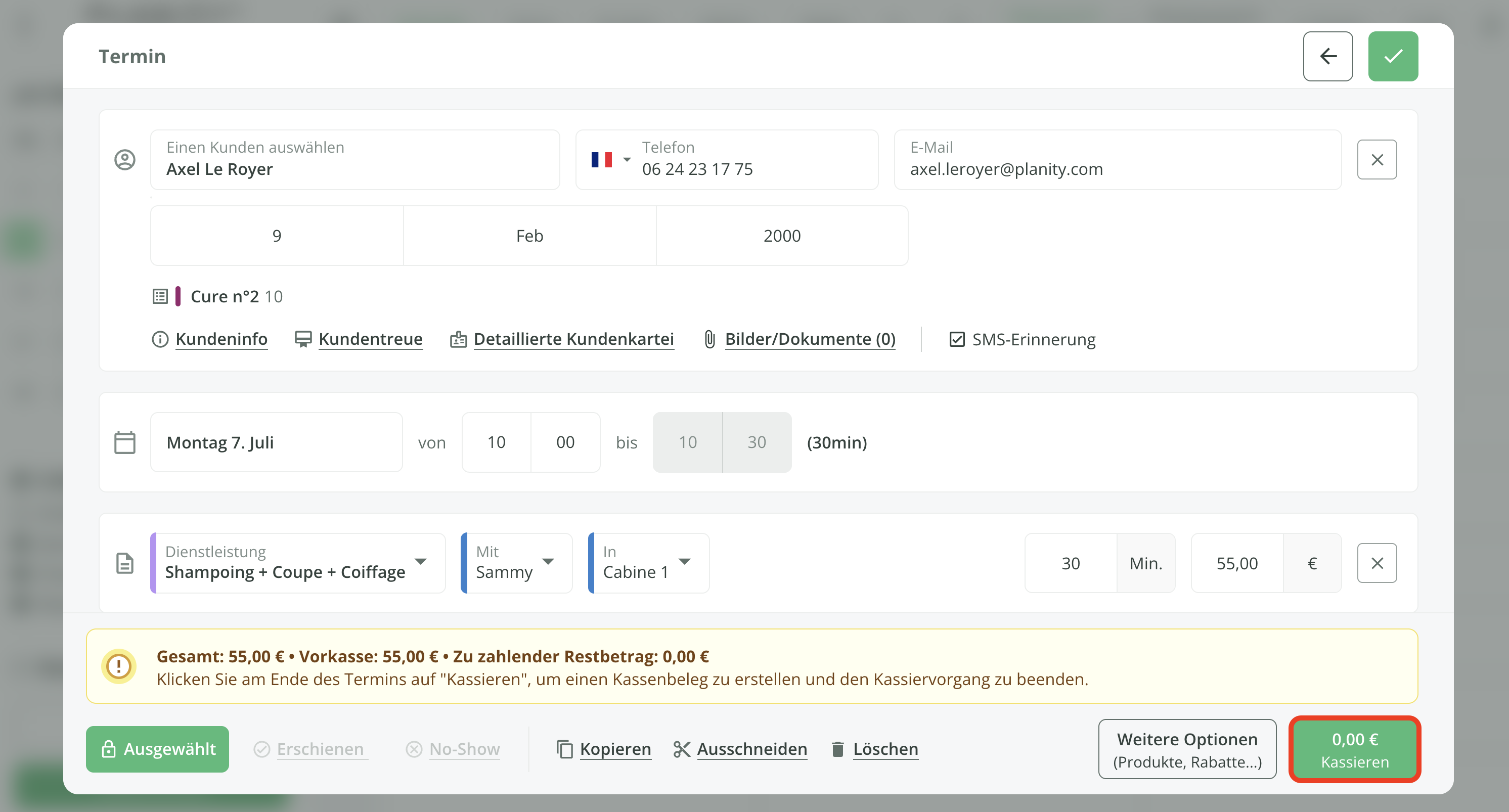 - Klicken Sie auf dem vorausbezahlten Termin auf „Kassieren“.