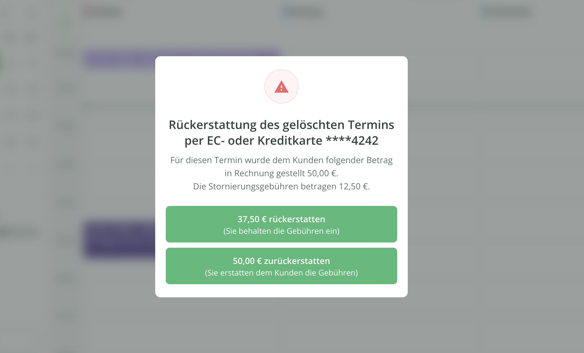 Es ist möglich, einen Termin außerhalb der festgelegten Stornierungsfrist zu löschen. Dabei können Sie entscheiden, ob Sie eine Strafgebühr erheben möchten oder nicht.