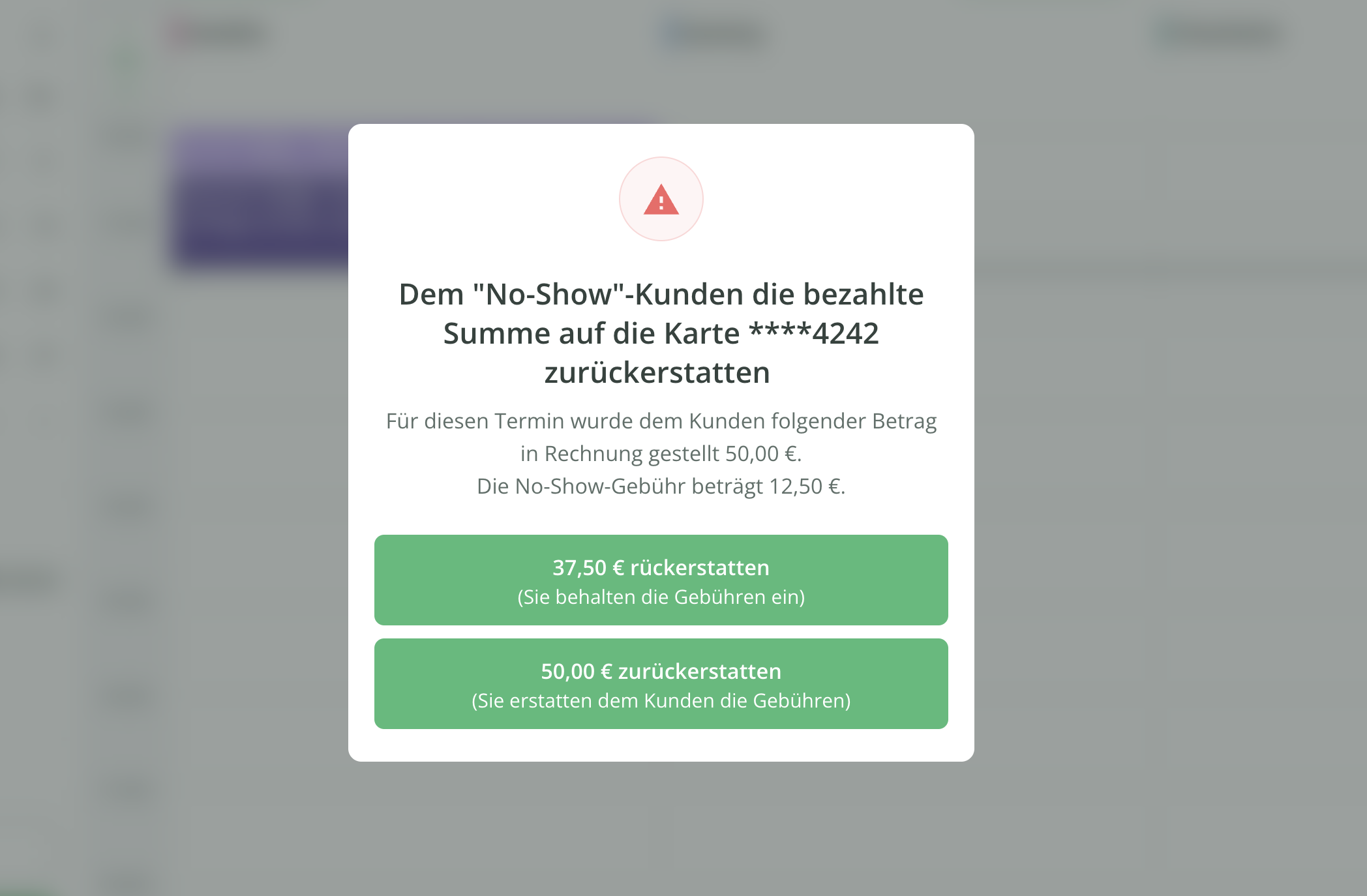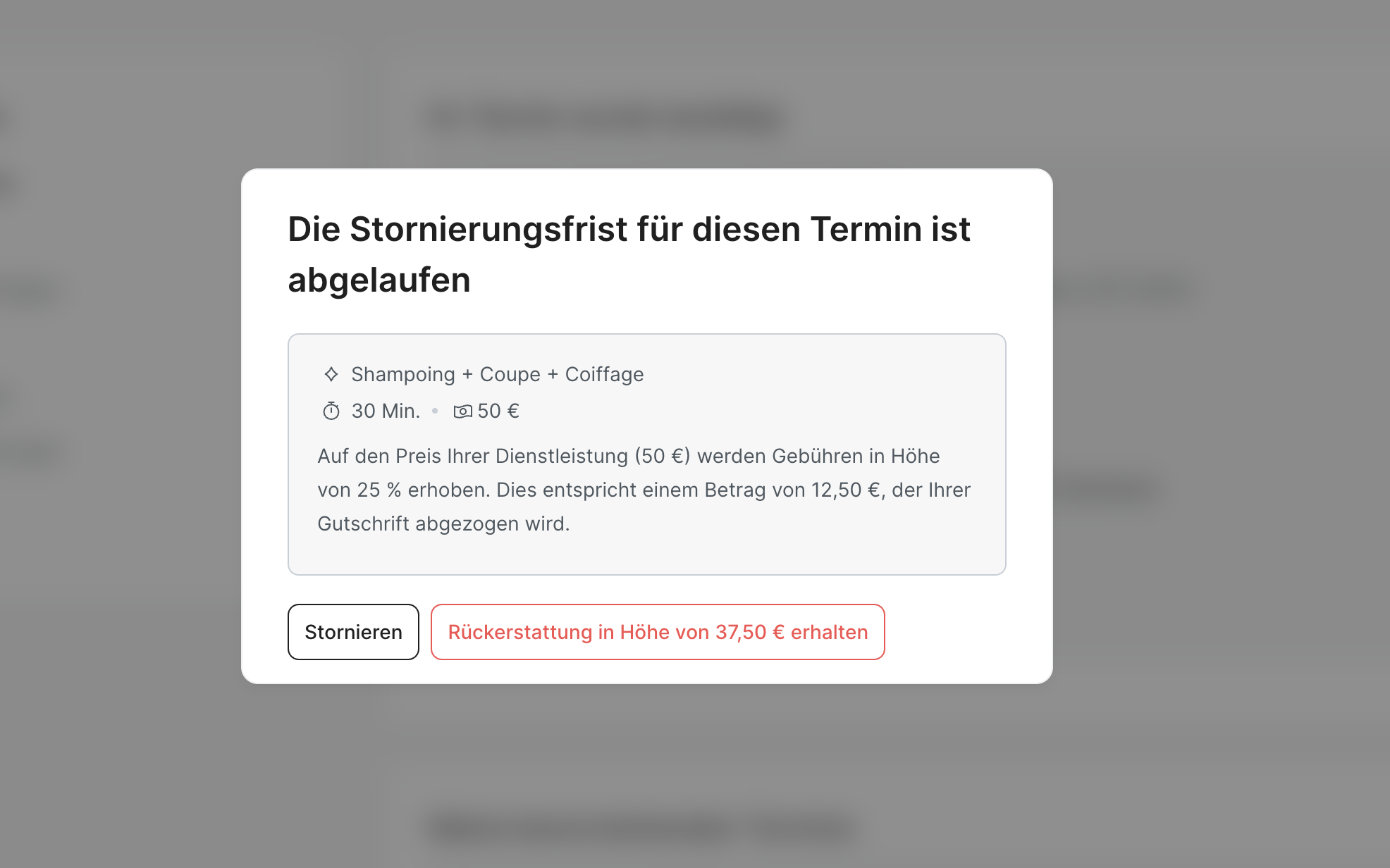 Bei Nichterscheinen können Sie entscheiden, ob Sie die Strafgebühr anwenden wollen oder nicht. Der Betrag für die Dienstleistung wird dem Kunden im Verhältnis zu den festgelegten Gebühren und der getroffenen Wahl zurückerstattet.