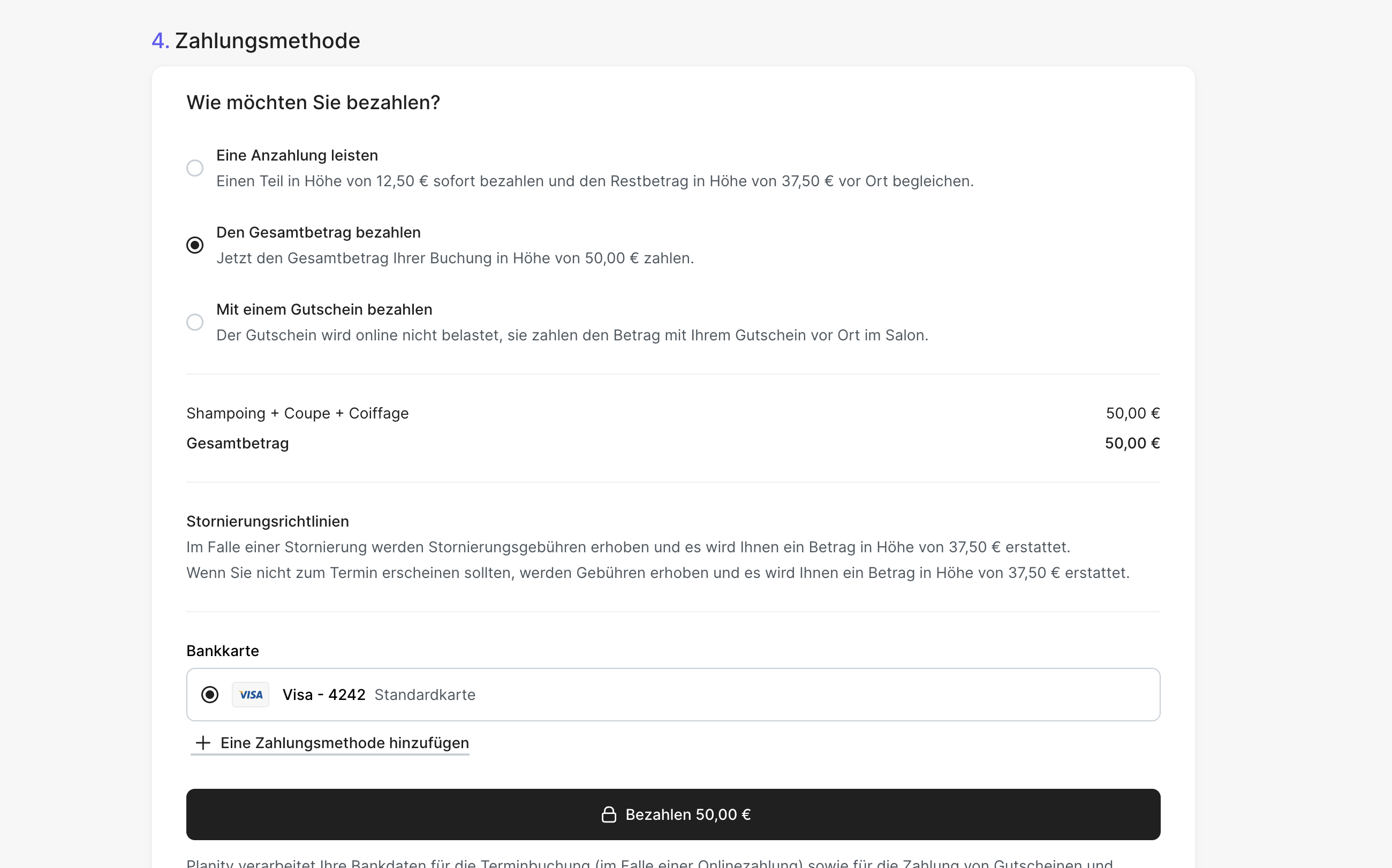 Auf planity.com kann Ihr Kunde nun seinen Termin im Voraus bezahlen, wenn die Vorauszahlung aktiviert ist.