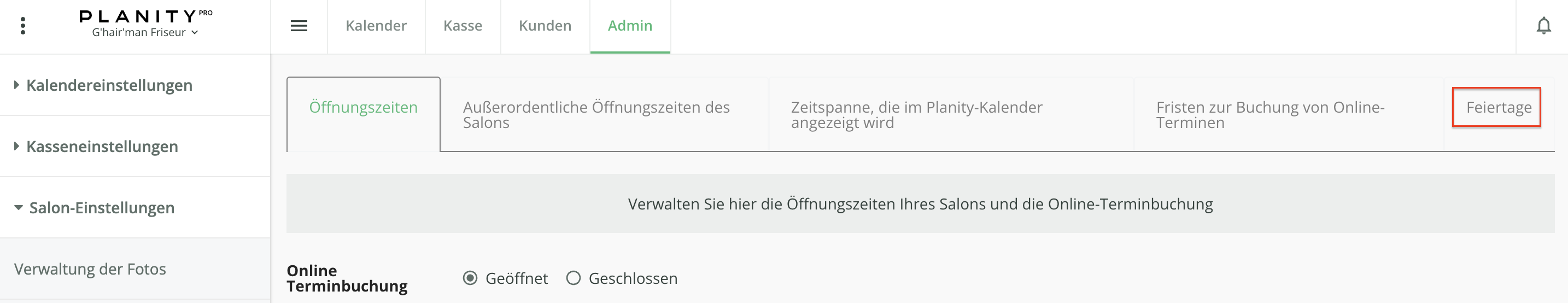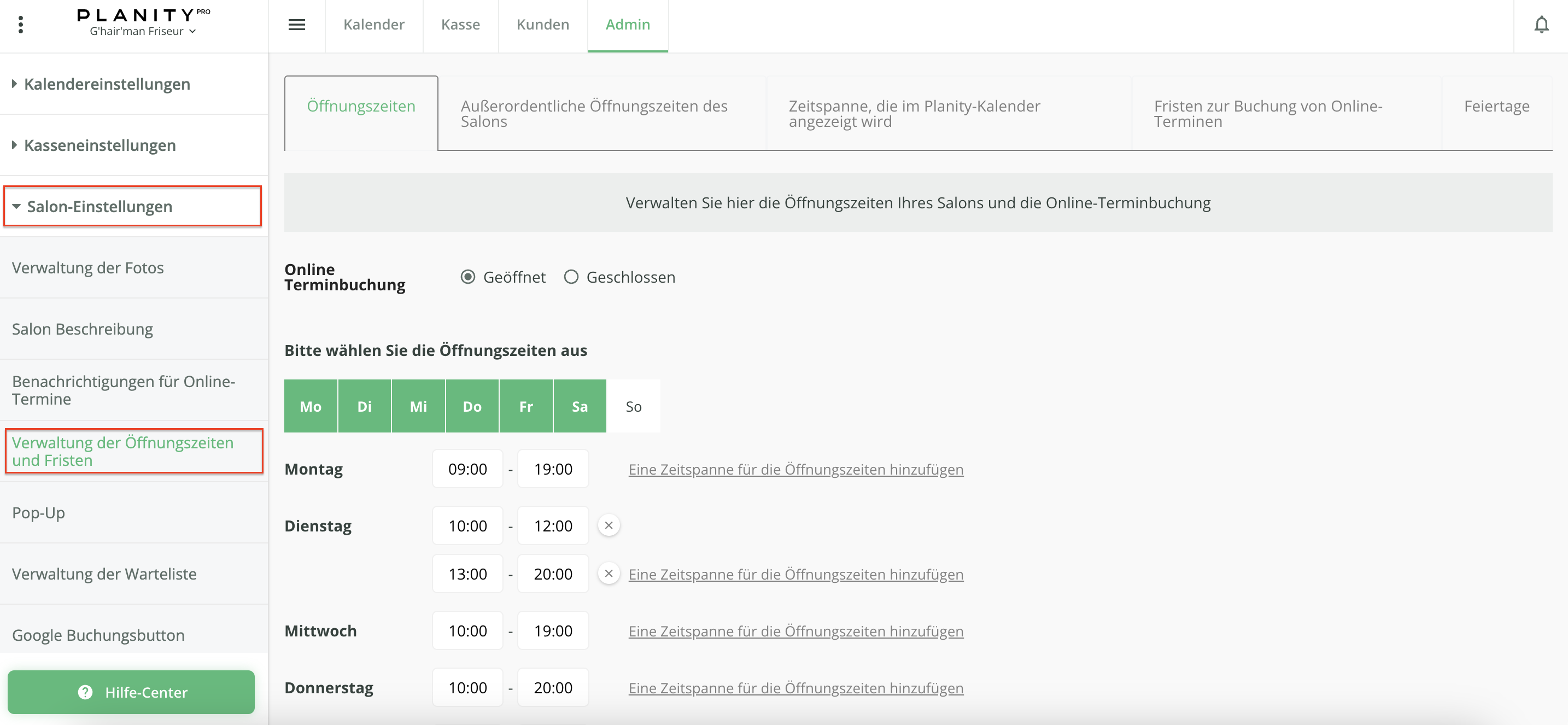 - Klicken Sie anschließend links auf den Reiter Salon-Einstellungen und wählen Sie den Menüpunkt Verwaltung der Öffnungszeiten und Fristen aus