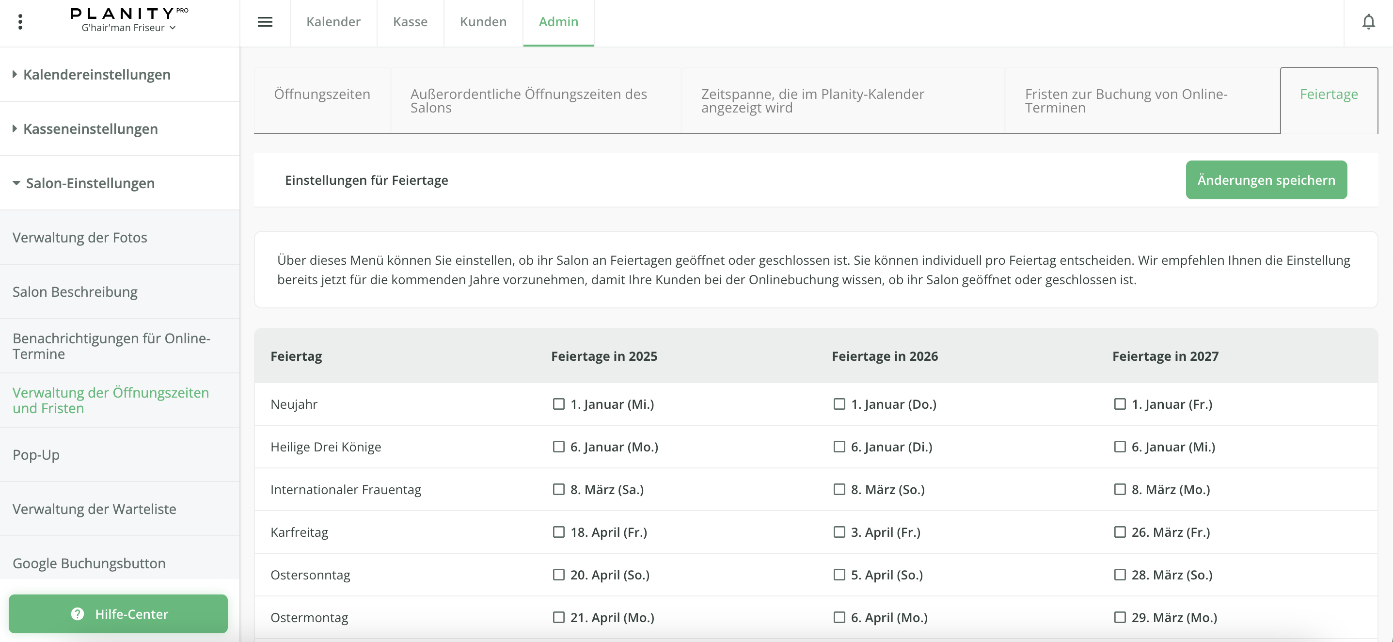 - Über dieses Menü haben Sie die Möglichkeit, Ihre Einstellungen für Feiertage für die nächsten drei Jahre vorzunehmen. Kreuzen Sie die für Ihr Bundesland relevanten Feiertage an, um Ihren Salon an diesen Tagen automatisch für die Online Terminbuchung zu sperren. Alle Mitarbeiter werden für diese Tage als nicht verfügbar im Kalender hinterlegt und Ihre Kunden können online keine Termine an diesen Tagen buchen.